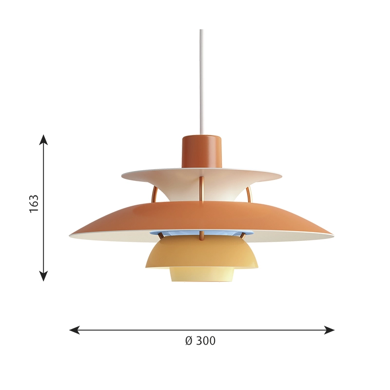 Dessinée en 1958 par Poul Henningsen pour Louis Poulsen, la suspension PH 5 tient son nom du diamètre de 50 cm de l’abat-jour principal du luminaire. À l’époque de sa création, personne ne se doutait que PH 5 finirait par incarner l’éclairage caractéristique de Poul Henningsen. La suspension se distingue par son éclairage 100 % anti-éblouissant, indépendamment de la source lumineuse employée et de la manière dont la lampe est installée. La suspension émet une lumière dirigée vers le bas et vers les côtés et s’éclaire donc elle-même. Intemporelle, PH 5 continue d'égayer les intérieurs les plus modernes grâce à sa palette de couleurs, tout comme PH 5 Mini. Cette suspension lancée en 2017 possède un abat-jour supérieur de 30 centimètres suivant les principes de Poul Henningsen. Ce premier redimensionnement de la célèbre suspension s’inscrit dans la volonté de Louis Poulsen d’accompagner la vie contemporaine et créative.