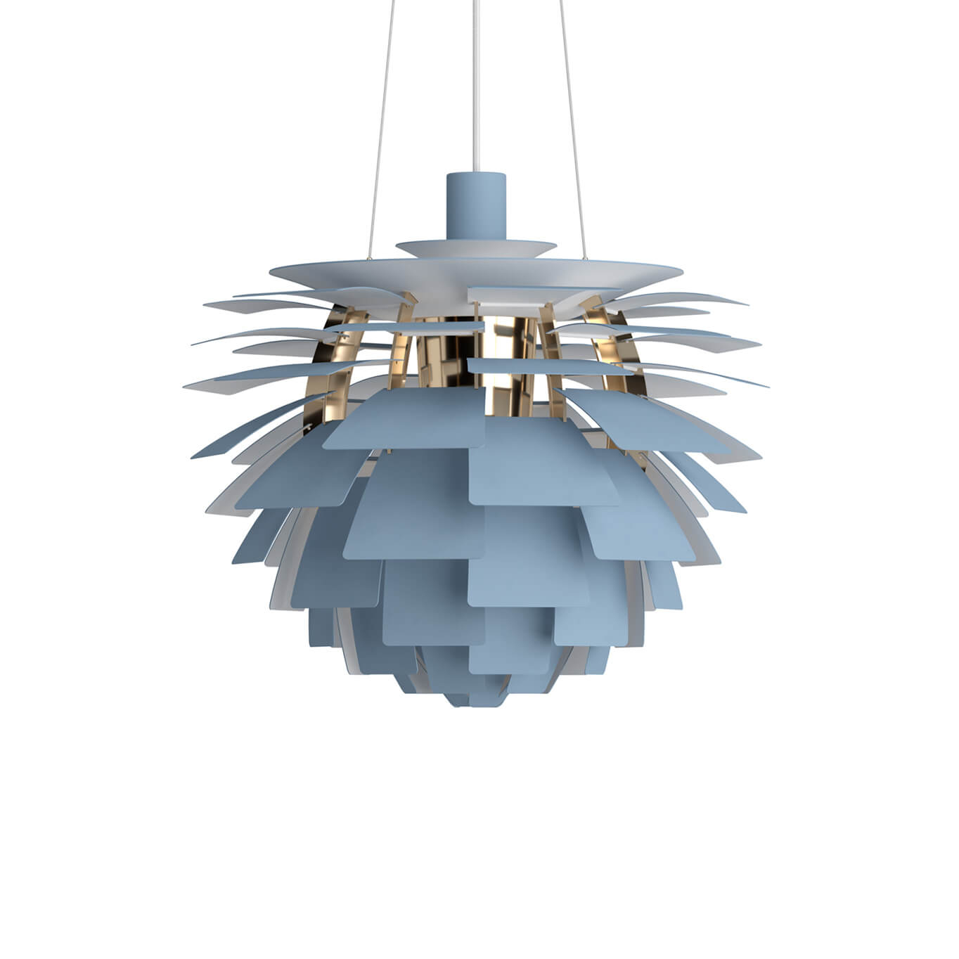 Dessinée par Poul Henningsen il y a plus de 40 ans, la suspension PH Artichoke est considérée aujourd'hui comme un classique du design. La structure est réalisée avec douze arches d'acier. Sur cette structure, Poul Henningsen a placé 72 feuilles de cuivre, et six lames sur chaque rangée. Chaque étage étant échelonné par rapport à la précédente, les 72 feuilles peuvent se couvrir l'une et l'autre. Cette conception permet une bonne vue du luminaire à partir de n'importe quel angle sans voir directement la source lumineuse située au centre de la suspension. Les PH Artichoke ont été développées à l'origine pour un restaurant de Copenhague nommé le Pavillon Langelinie, où elles peuvent encore être admirées aujourd'hui.
