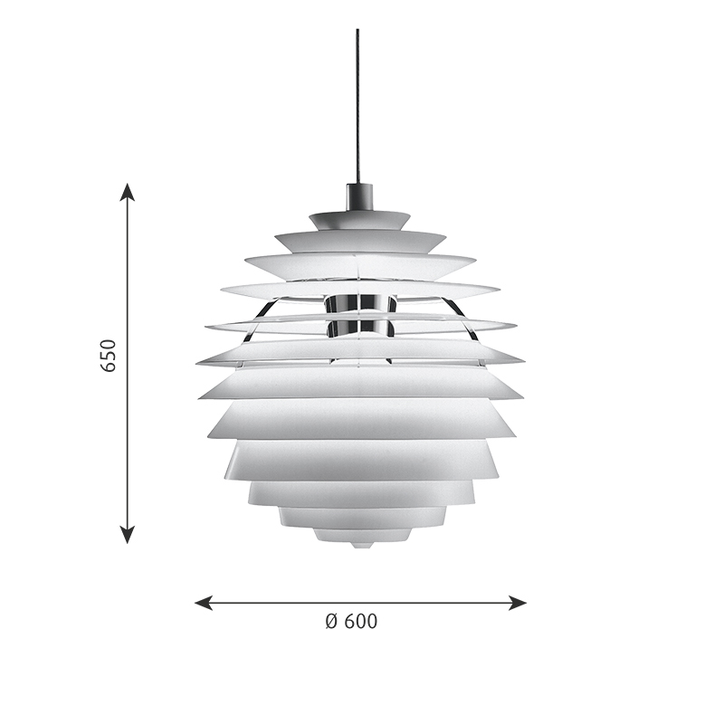 PH Louvre a été conçue par Poul Henningsen pour l’église adventiste de Skodborg, au Danemark, en 1957. La suspension en forme de globe est composée de 13 abat-jour montés sur quatre supports. Il s’agit d’une version simplifiée d’un luminaire plus ancien dessiné par Poul Henningsen en 1942, la Spirale. Edité par