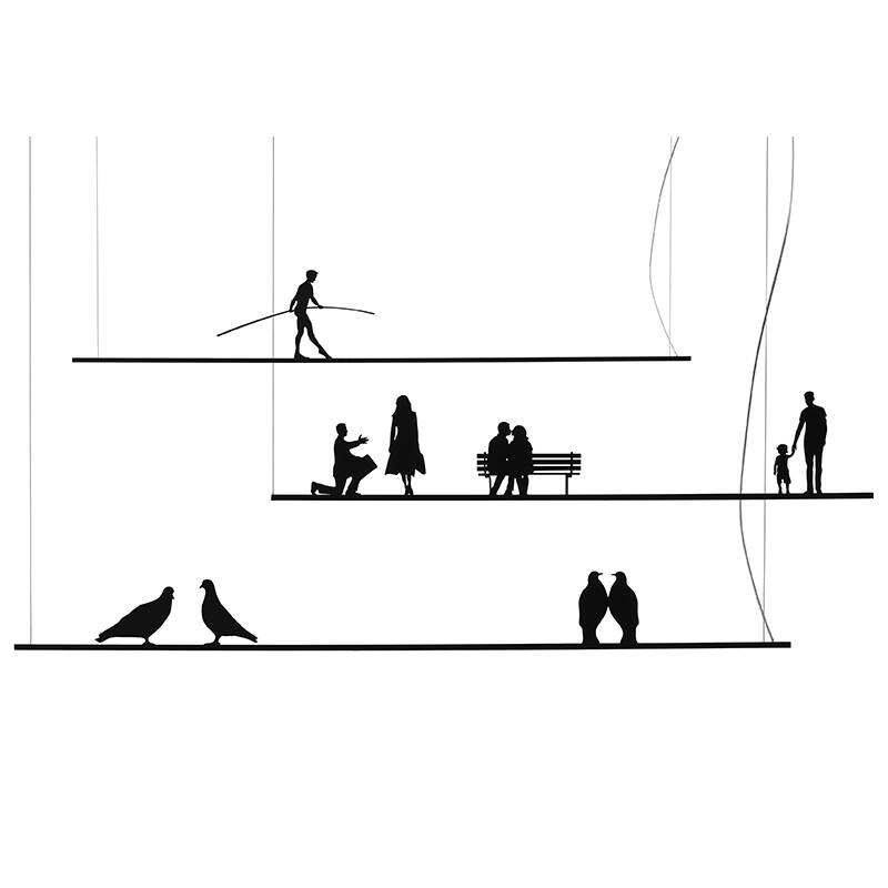 Phil est une suspension en métal noir, imaginé comme un fil tendu dans l’espace et traversé par des histoires. Cette lampe graphique et légère oscille entre fantaisie et réalité. Des silhouettes rétroéclairées se détachent dans l’espace et racontent des histoires d’entreprises impossibles ou de la vie de tous les jours. Les silhouettes peuvent être placées où vous le souhaitez sur toute la longueur de la suspension. Disponible avec différents kits de silhouettes, la