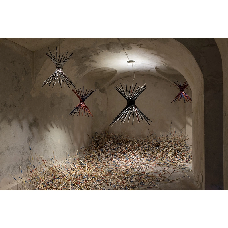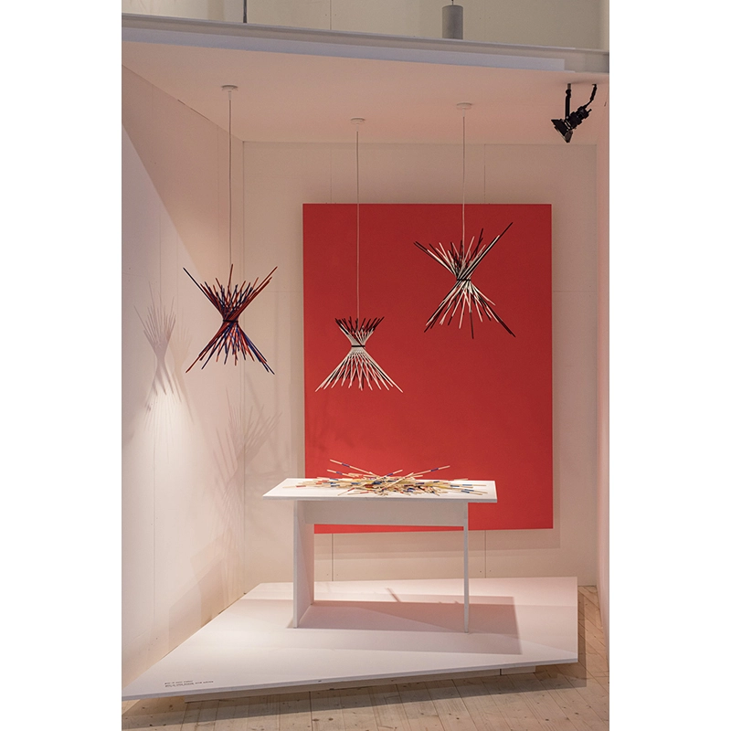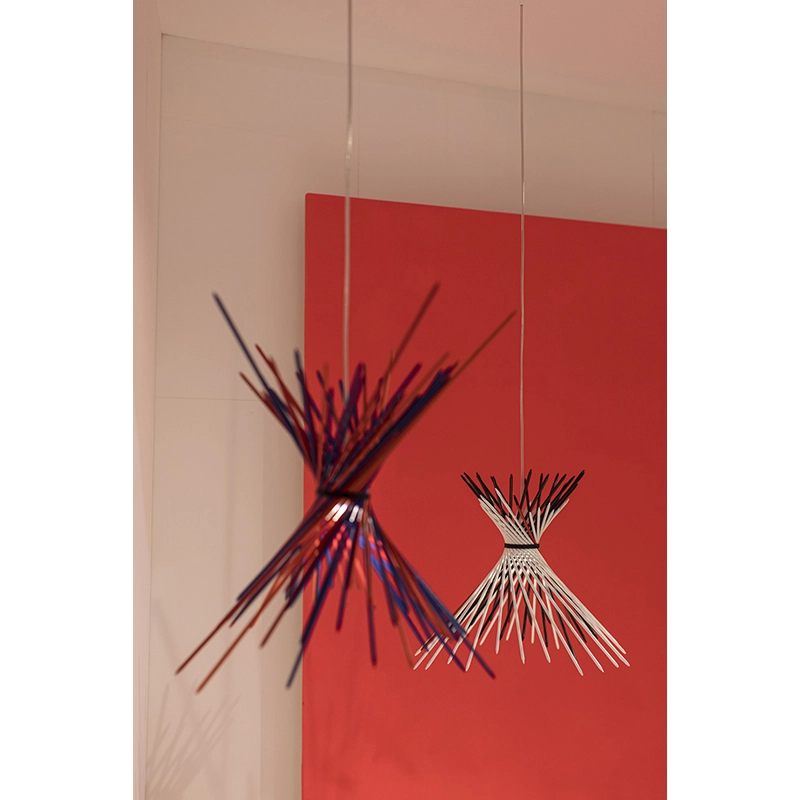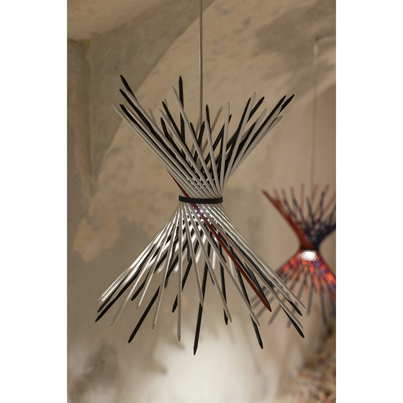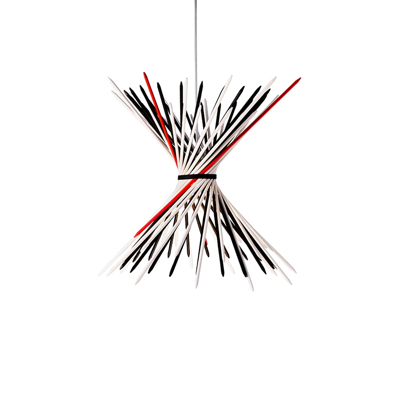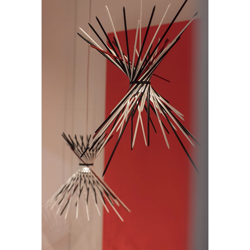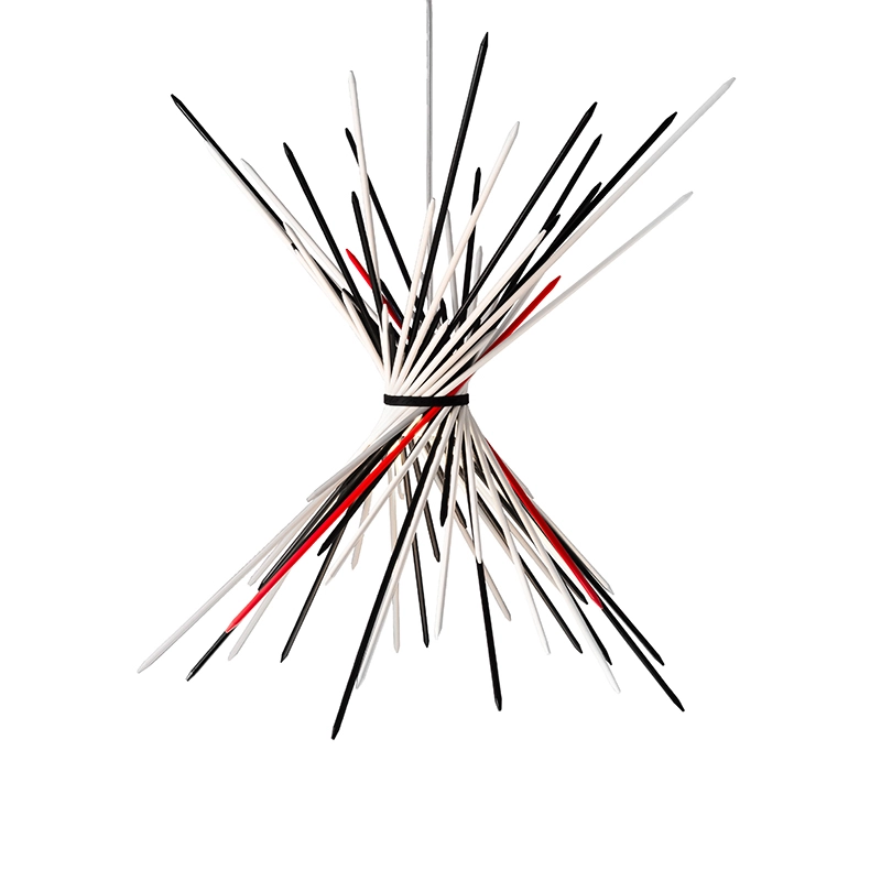 La suspension Pic-a-stic d’Andreas Walther pour Ingo Maurer est une suspension originale et ludique. Inspirée du jeu d'adresse Mikado, elle se compose de longues tiges en bois laqué, disposées autour du corps lumineux et maintenues par un anneau en caoutchouc noir flexible. La position des tiges peut ainsi être modifiée à tout moment. Le luminaire est disponible en kit, ce qui permet à chaque propriétaire de créer lui-même un objet lumineux individuel en quelques gestes. Le suspension Pic-a-stic est disponible en deux versions : une version avec des baguettes noires, blanches et rouges et une version colorée avec des baguettes bleues, rouges et oranges. Editée par Ingo Maurer, la suspension Pic-a-Stic allie de manière originale espièglerie et poésie dans un luminaire unique.