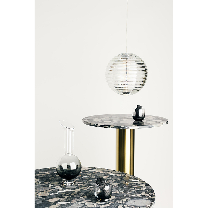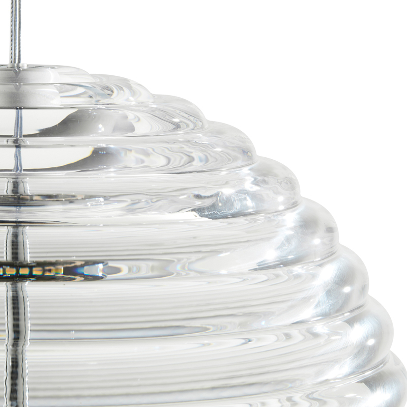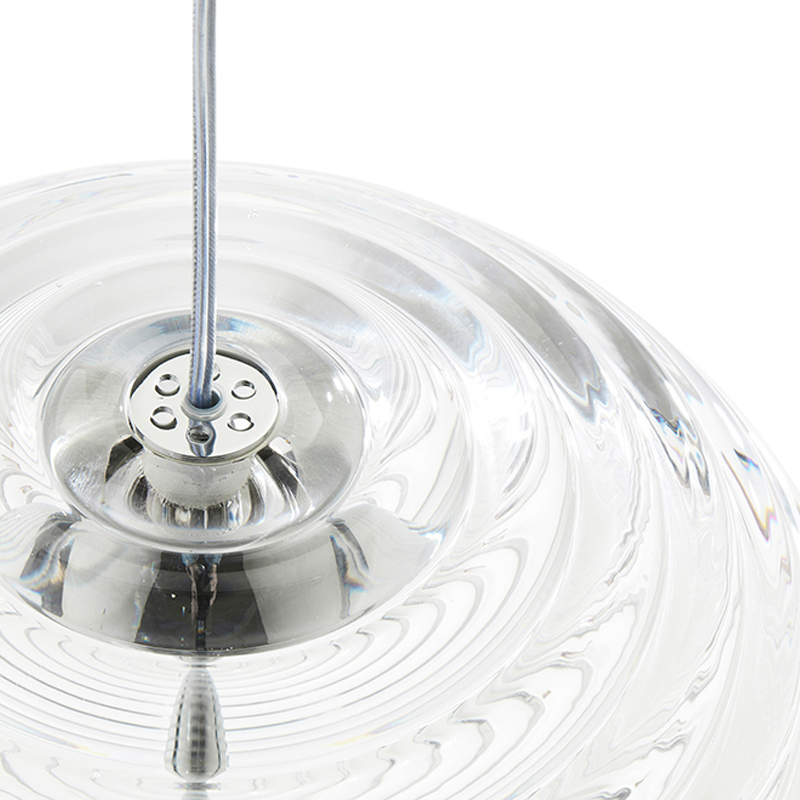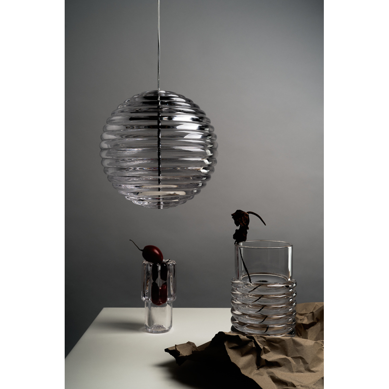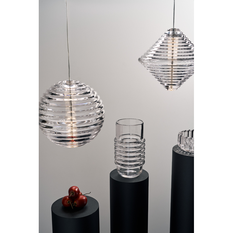 suspension Press Sphere présente une surface striée joliment arrondie. Le verre nervuré permet une diffusion harmonieuse de la lumière, créant ainsi des motifs linéaires et rayés captivants. Cette