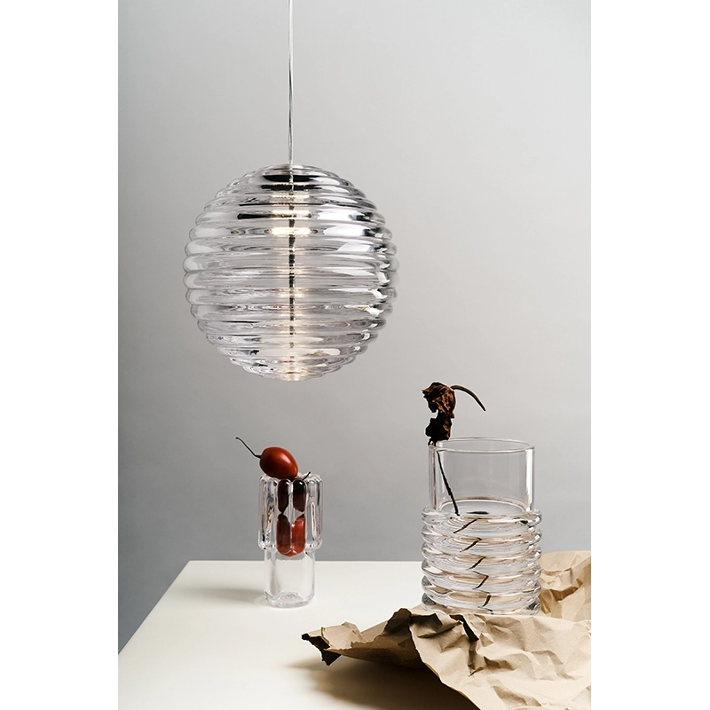 Tom Dixon édite Press Sphere, une suspension de la série Press, conçue avec du verre épais ultra transparent. La suspension Press Sphere présente une surface striée joliment arrondie. Le verre nervuré permet une diffusion harmonieuse de la lumière, créant ainsi des motifs linéaires et rayés captivants. Cette suspension se distingue par sa silhouette originale et sa simplicité fonctionnelle. Press Sphere est fabriquée en déversant des boules de verre fondu à une température de 1200 degrés Celsius, qui sont ensuite pressées dans des moules en fer sous une forte pression, garantissant ainsi la durabilité exceptionnelle de ces luminaires. La collection Press de Tom Dixon comprend également une suspension en forme de cône, ainsi qu'une applique.