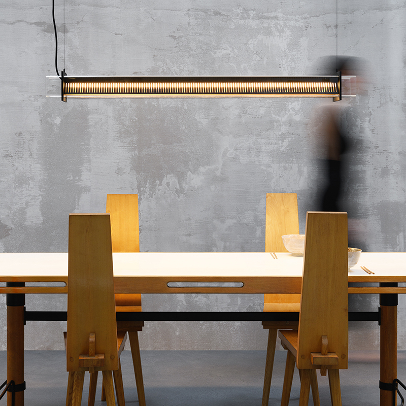 Dessinée par Jean-Michel Wilmotte pour la marque Sammode, Quadratube P1 est une suspension à la silhouette élégante qui se décline en deux longueurs (130 cm ou 160 cm). En plus d’un éclairage direct, ses perforations rectangulaires rappelant les persiennes diffusent subtilement la lumière sur les côtés, créant une ambiance douce et agréable. Bien au-delà de l’objet lumineux, la suspension Quadratube intègre un module LED et un réflecteur pour une qualité d’éclairage et un confort visuel remarquables. L’intégration du câble d’alimentation dans une encoche en partie supérieure témoigne de l’attention particulière portée aux détails. La collection Quadratube Sammode comprend différents modèles d’appliques et de suspensions pour s’adapter à tous les espaces.