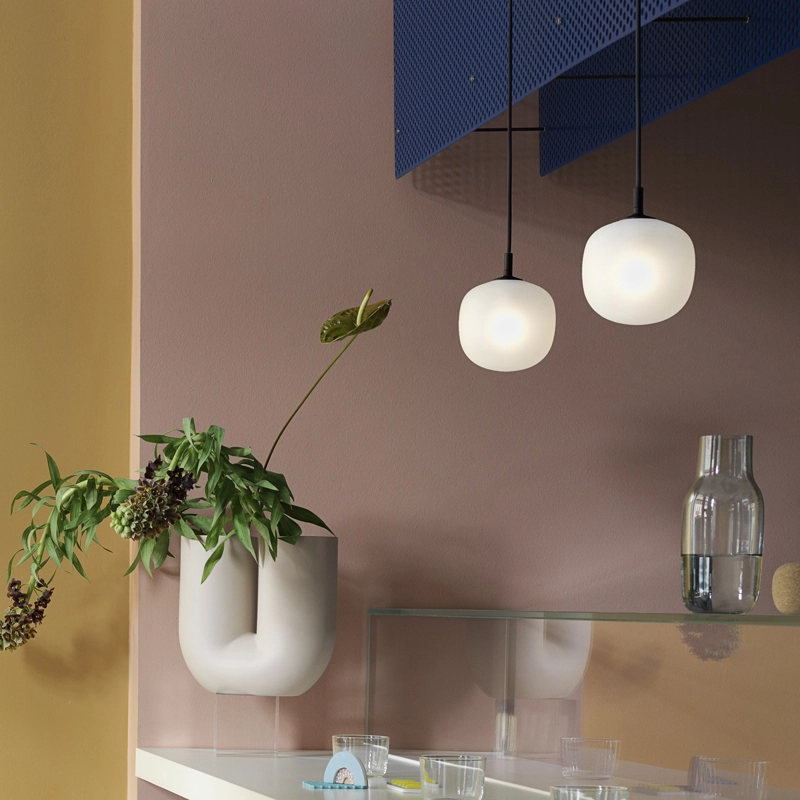 Rime se démarque par une forme pleine de caractère qui s’intègre dans toutes les atmosphères, complétée par une partie supérieure en finition époxy et un cordon d’alimentation assorti, qui ajoutent une touche moderne. Grâce à l’opacité du verre, la suspension
