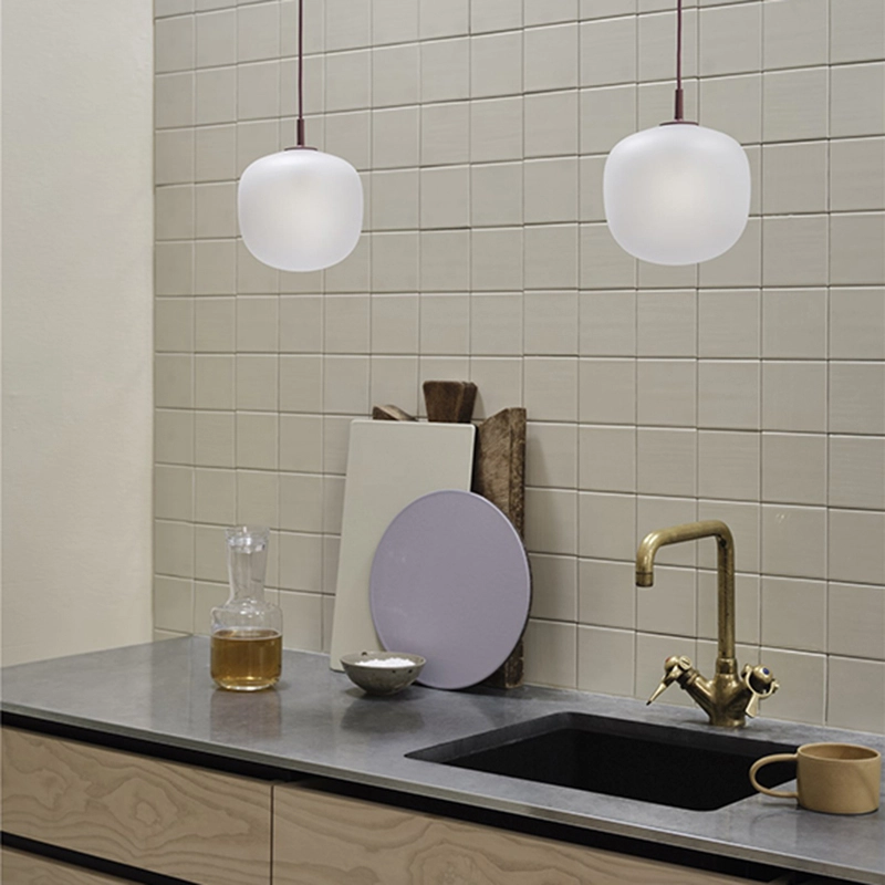 Rime apporte une perspective contemporaine à la suspension en verre traditionnelle. Le diffuseur en verre semi-transparent a été sablé, créant une surface à l’expression raffinée et permettant de discerner subtilement la source de lumière. Le design de