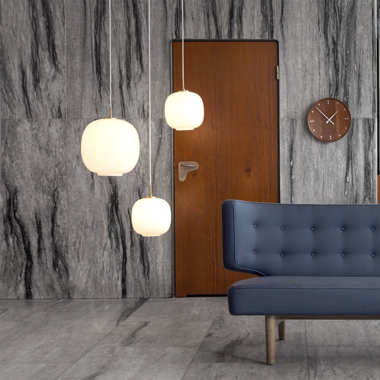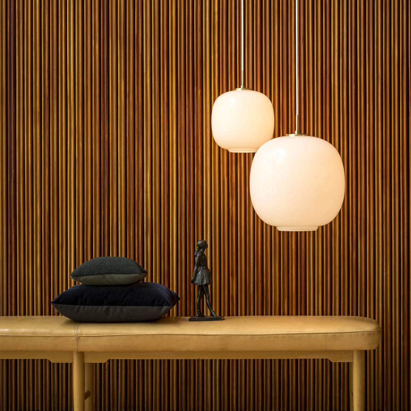 En 2016, la suspension Radiohus Pendant fait son retour sous l’appellation VL45 Radiohus Pendant. Elle avait été dessinée dans les années 1940 par l’architecte danois Vilhelm Lauritzen en partenariat avec Louis Poulsen pour la construction de la maison de la radio à Copenhague (Radiohuset). La suspension respecte le dessin d’origine, avec un support en laiton et un abat-jour de trois couches de verre soufflé. Les couches externe et interne sont constituées de verre poli transparent, tandis que la couche intermédiaire est réalisée en verre blanc. Le luminaire fournit une lumière homogène et diffuse.