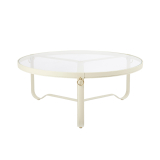table basse Adnet incarne tout ce que l'architecte et décorateur d'intérieur français représente et allie parfaitement son style Art Déco à son fort engagement envers les principes fonctionnalistes. Posé sur trois pieds en métal courbé, se rejoignant élégamment au cœur de la table, le plateau rond en verre est bordé d'une bande de cuir et orné de trois anneaux en laiton doré. Grâce à des matériaux modernes et un superbe savoir-faire artisanal,