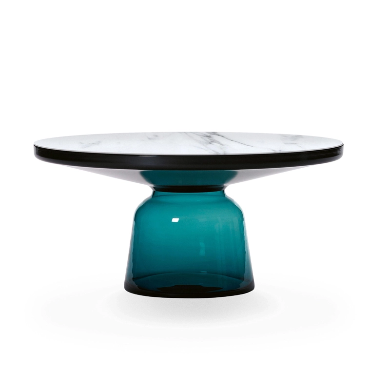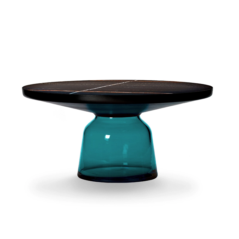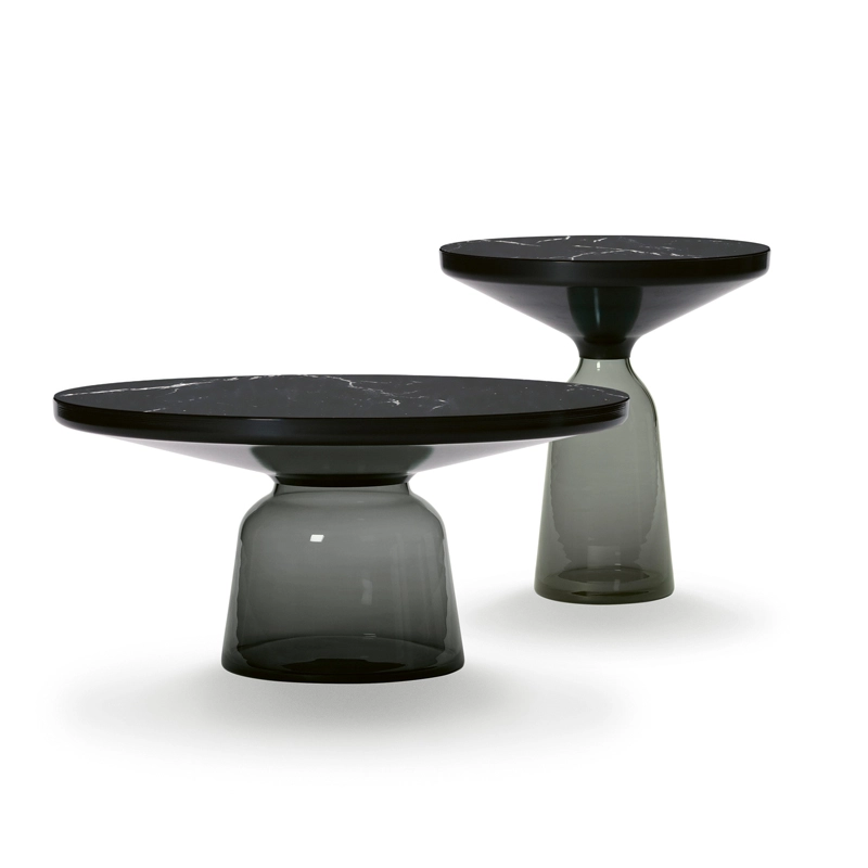Désormais disponible avec un plateau en marbre, la collection Bell Table de Sebastian Herkner bouleverse l'usage habituel des matériaux en associant le verre, matériau léger et fragile utilisé pour la base, et un plateau réalisé en métal, qui semble flotter au-dessus. Le piétement en verre teinté est soufflé de façon traditionnelle dans un moule en bois. Avec sa présence sculpturale, il contraste avec le cadre en laiton tout en formant une unité harmonieuse rappelant les courbes d'une cloche. Grâce à ses surfaces réfléchissantes et ses matériaux opposés, la Bell Table ajoute une touche raffinée et délicate dans le salon. Elle célèbre la beauté des matériaux avec leurs couleurs et leurs formes, associées aux qualités d'un travail artisanal rigoureux. La table basse design Bell Coffee et la table d'appoint Bell Side sont des pièces uniques et fragiles, chacune étant réalisée intégralement à la main et éditée par Classicon.