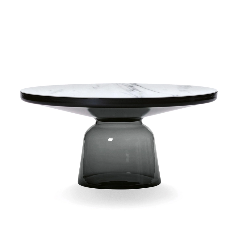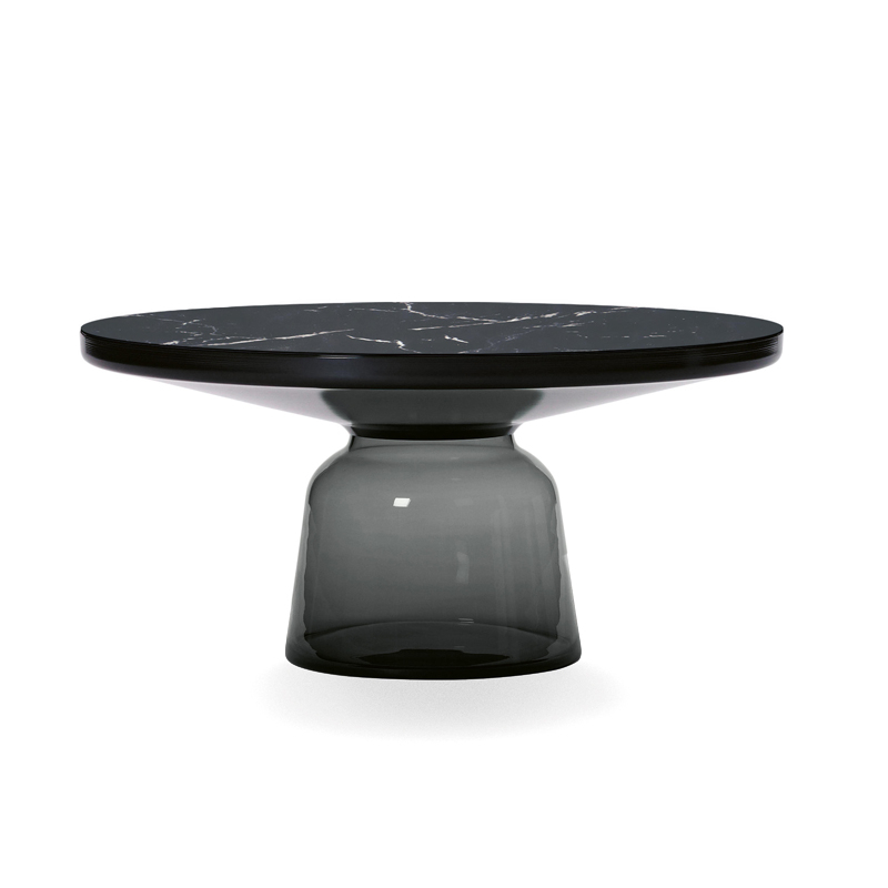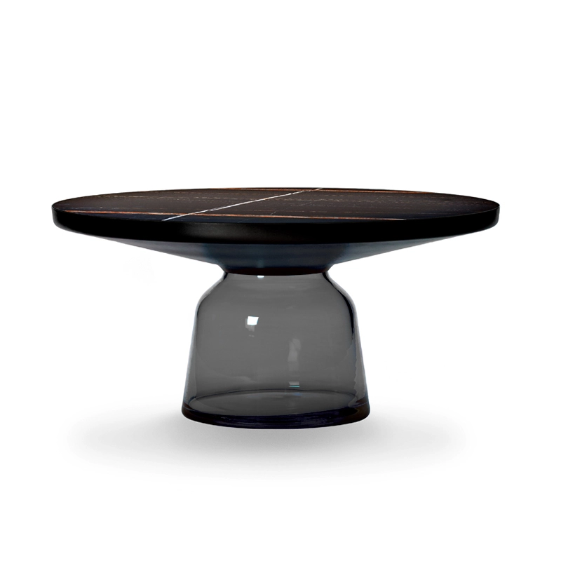 Désormais disponible avec un plateau en marbre, la collection Bell Table de Sebastian Herkner bouleverse l'usage habituel des matériaux en associant le verre, matériau léger et fragile utilisé pour la base, et un plateau réalisé en métal, qui semble flotter au-dessus. Le piétement en verre teinté est soufflé de façon traditionnelle dans un moule en bois. Avec sa présence sculpturale, il contraste avec le cadre en laiton tout en formant une unité harmonieuse rappelant les courbes d'une cloche. Grâce à ses surfaces réfléchissantes et ses matériaux opposés, la