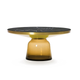 Désormais disponible avec un plateau en marbre, la collection Bell Table de Sebastian Herkner bouleverse l'usage habituel des matériaux en associant le verre, matériau léger et fragile utilisé pour la base, et un plateau réalisé en métal, qui semble flotter au-dessus. Le piétement en verre teinté est soufflé de façon traditionnelle dans un moule en bois. Avec sa présence sculpturale, il contraste avec le cadre en laiton tout en formant une unité harmonieuse rappelant les courbes d'une cloche. Grâce à ses surfaces réfléchissantes et ses matériaux opposés, la