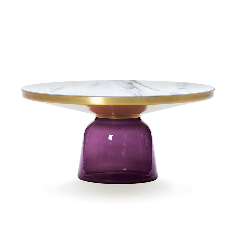 Désormais disponible avec un plateau en marbre, la collection Bell Table de Sebastian Herkner bouleverse l'usage habituel des matériaux en associant le verre, matériau léger et fragile utilisé pour la base, et un plateau réalisé en métal, qui semble flotter au-dessus. Le piétement en verre teinté est soufflé de façon traditionnelle dans un moule en bois. Avec sa présence sculpturale, il contraste avec le cadre en laiton tout en formant une unité harmonieuse rappelant les courbes d'une cloche. Grâce à ses surfaces réfléchissantes et ses matériaux opposés, la Bell Table ajoute une touche raffinée et délicate dans le salon. Elle célèbre la beauté des matériaux avec leurs couleurs et leurs formes, associées aux qualités d'un travail artisanal rigoureux. La table basse design Bell Coffee et la table d'appoint Bell Side sont des pièces uniques et fragiles, chacune étant réalisée intégralement à la main et éditée par Classicon.