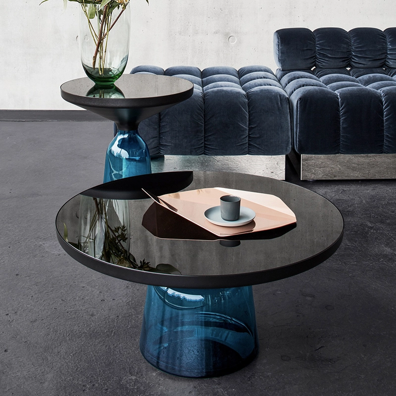 La collection Bell Table de Sebastian Herkner bouleverse l'usage habituel des matériaux en associant le verre, matériau léger et fragile utilisé pour la base, et un plateau réalisé en métal, qui semble flotter au-dessus. Le piétement en verre teinté est soufflé de façon traditionnelle dans un moule en bois. Avec sa présence sculpturale, il contraste avec le cadre en laiton tout en formant une unité harmonieuse rappelant les courbes d'une cloche. Grâce à ses surfaces réfléchissantes et ses matériaux opposés, la Bell Table ajoute une touche raffinée et délicate dans le salon. Elle célèbre la beauté des matériaux avec leurs couleurs et leurs formes, associées aux qualités d'un travail artisanal rigoureux. La table basse Bell Coffee et la table d'appoint Bell Side sont des pièces uniques et fragiles, chacune étant réalisée intégralement à la main et éditée par Classicon.