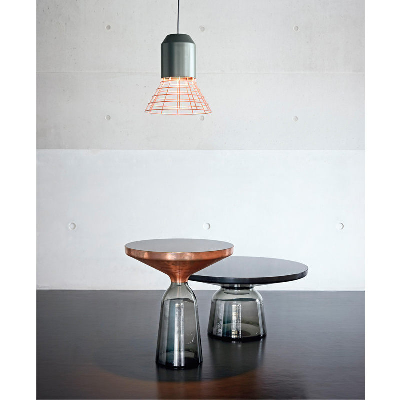 La collection Bell Table de Sebastian Herkner bouleverse l'usage habituel des matériaux en associant le verre, matériau léger et fragile utilisé pour la base, et un plateau réalisé en métal, qui semble flotter au-dessus. Le piétement en verre teinté est soufflé de façon traditionnelle dans un moule en bois. Avec sa présence sculpturale, il contraste avec le cadre en laiton tout en formant une unité harmonieuse rappelant les courbes d'une cloche. Grâce à ses surfaces réfléchissantes et ses matériaux opposés, la Bell Table ajoute une touche raffinée et délicate dans le salon. Elle célèbre la beauté des matériaux avec leurs couleurs et leurs formes, associées aux qualités d'un travail artisanal rigoureux. La table basse Bell Coffee et la table d'appoint Bell Side sont des pièces uniques et fragiles, chacune étant réalisée intégralement à la main et éditée par Classicon.
