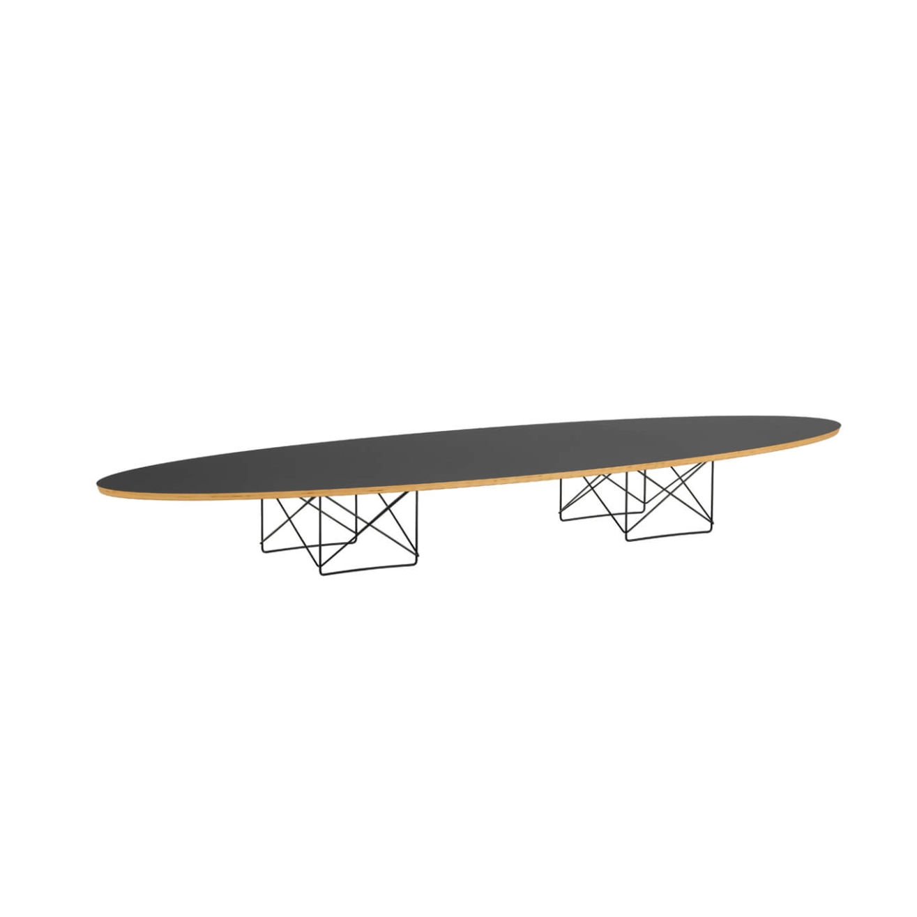 Avec sa silhouette elliptique élégante, la table basse Elliptical, dessinée par Charles et Ray Eames en 1951, a rapidement été surnommée « Surfboard Table » (planche de surf) en raison de sa forme. Avec ses deux piètements en acier chromé, la table, éditée par Vitra, reprend un thème repris à l'infini par les Eames, les fils d'acier courbés et soudés pour former une structure stable à l'aspect léger. Son plateau est en stratifié haute pression noir, très résistant, avec un délicat chant couleur kraft.