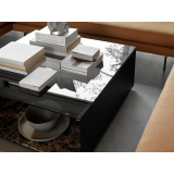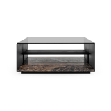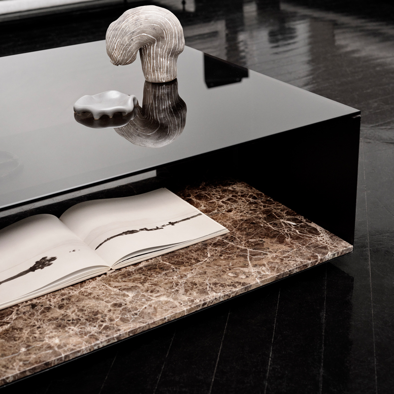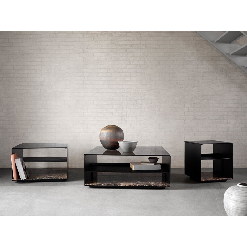 Le plateau en verre fumé repose sur une structure en acier, tandis qu’une dalle en marbre à la base apporte équilibre et stabilité. Entre le plateau et la base, une étagère en acier renforce l’ensemble et fournit un espace de rangement. L’étagère qui représente deux tiers des dimensions de la table permet de ranger de plus grands objets d’un côté, tels que des livres.