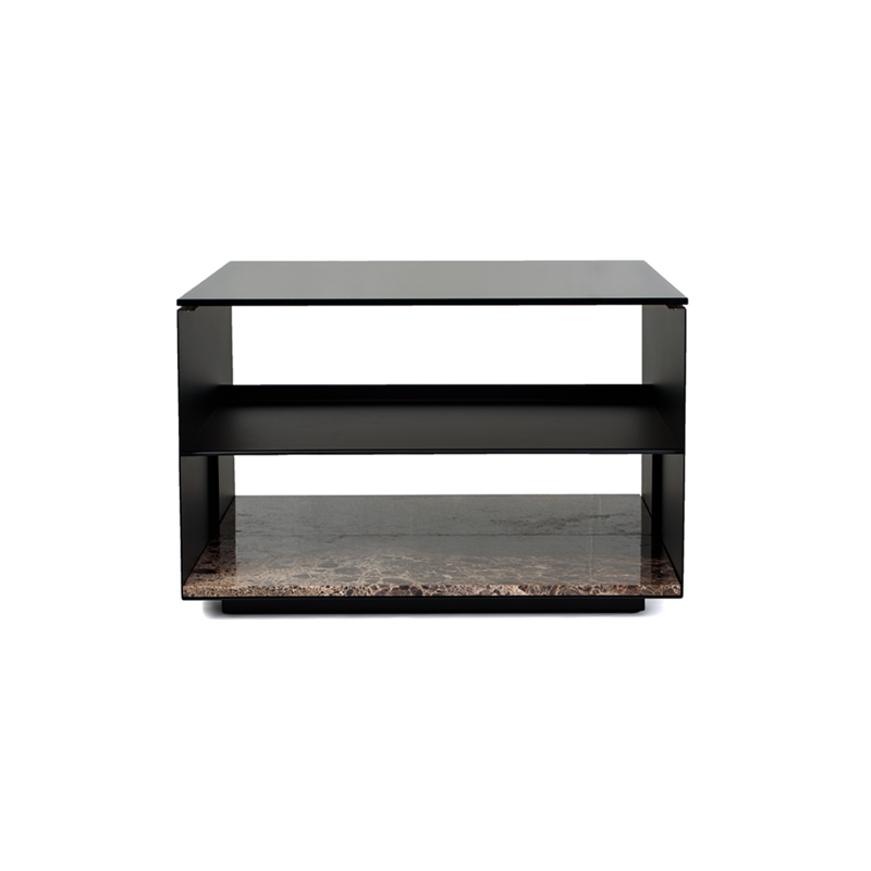 verre fumé, marbre emperador, acier finition époxy noir