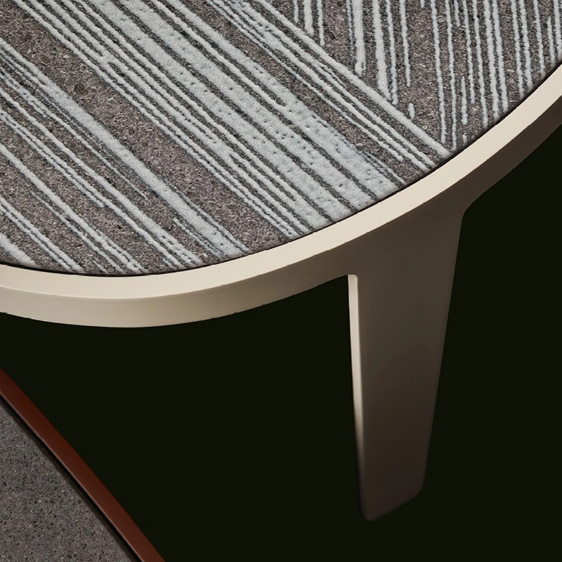 La collection de sièges Mad Out de Poliform, conçue par Marcel Wanders, est complétée par la série homonyme de tables basses. Le plateau en pierre de lave, dans deux tons différents qui dépendent des températures de cuisson très élevées, peut être orné d’une décoration en poudre de verre, créant un contraste intéressant entre les surfaces opaques et brillantes.