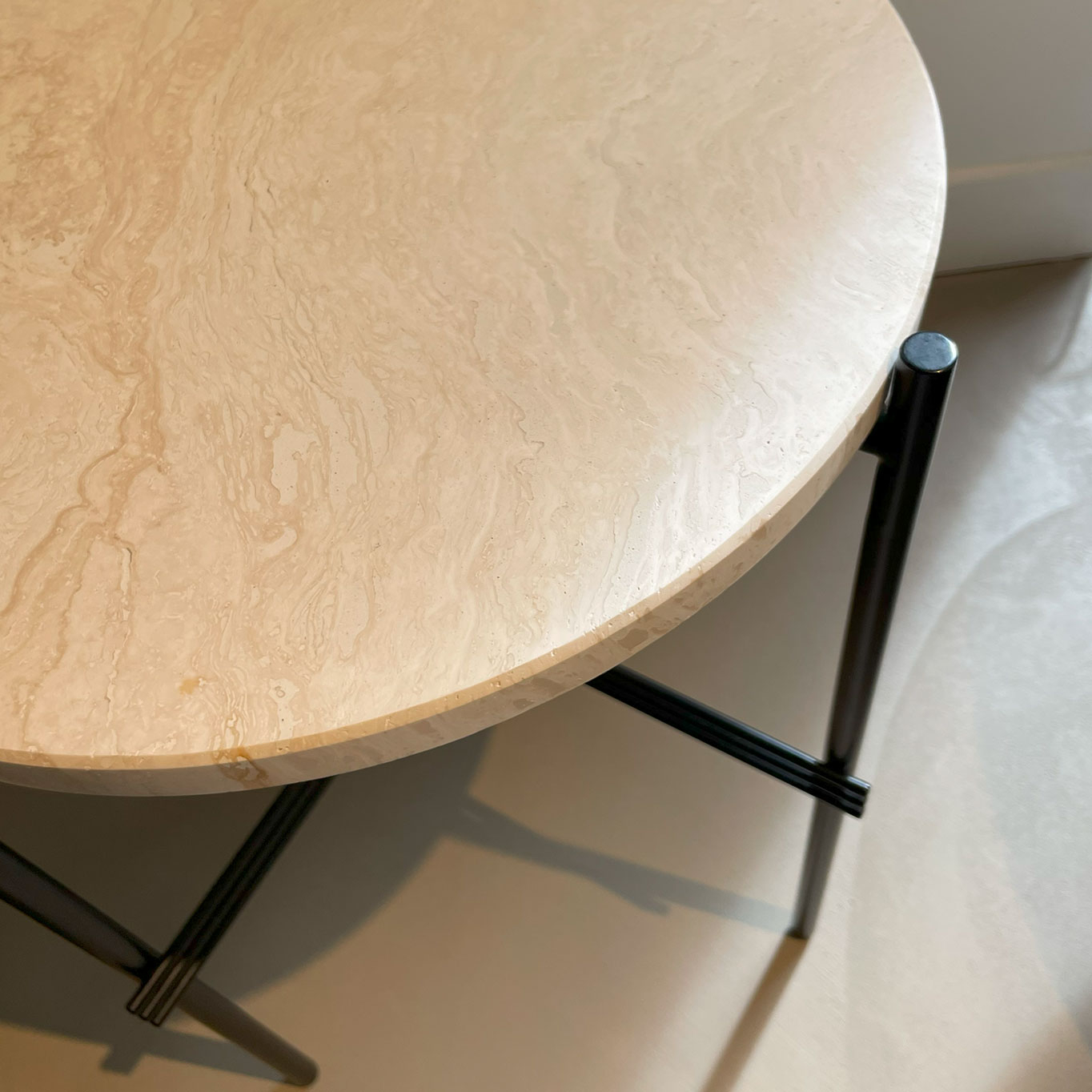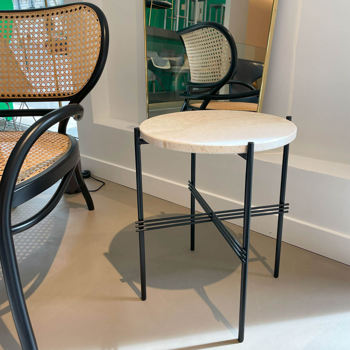 Créée par le duo GamFratesi pour Gubi en 2014, la collection TS est devenue une icône du design contemporain. Avec son plateau en travertin blanc veiné et son piètement géométrique en métal noir, la table guéridon TS Outdoor combine élégance sculpturale et fonctionnalité, aussi bien en intérieur qu'en extérieur. Conçue pour l’extérieur, cette version du guéridon TS bénéficie d’un traitement spécifique du travertin, comblant les crevasses naturelles de la pierre pour offrir une surface lisse, résistante et facile à entretenir. Le piètement en acier inoxydable finition epoxy noire assure stabilité et durabilité, même en conditions extérieures. Comme tout matériau naturel, le travertin évolue avec le temps, développant une patine unique qui renforce son charme. Il est cependant recommandé de rentrer la table en cas de fortes chaleurs ou de gel, pour préserver l’intégrité de la pierre.