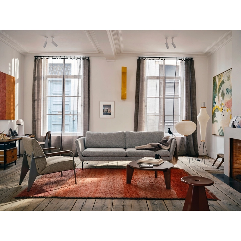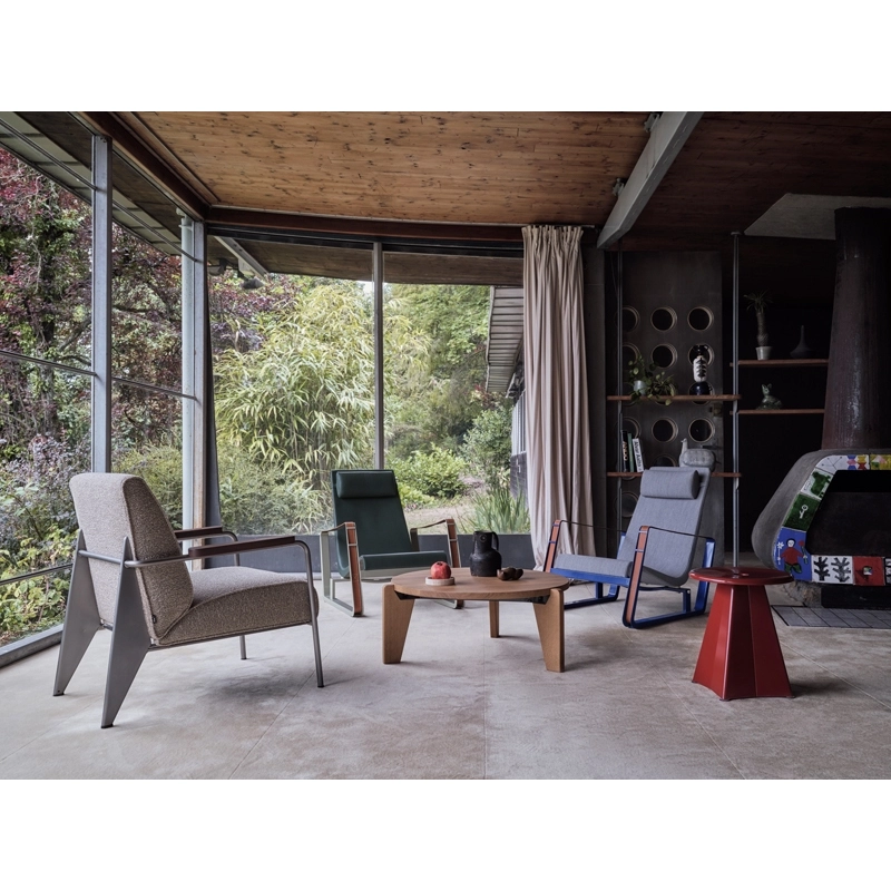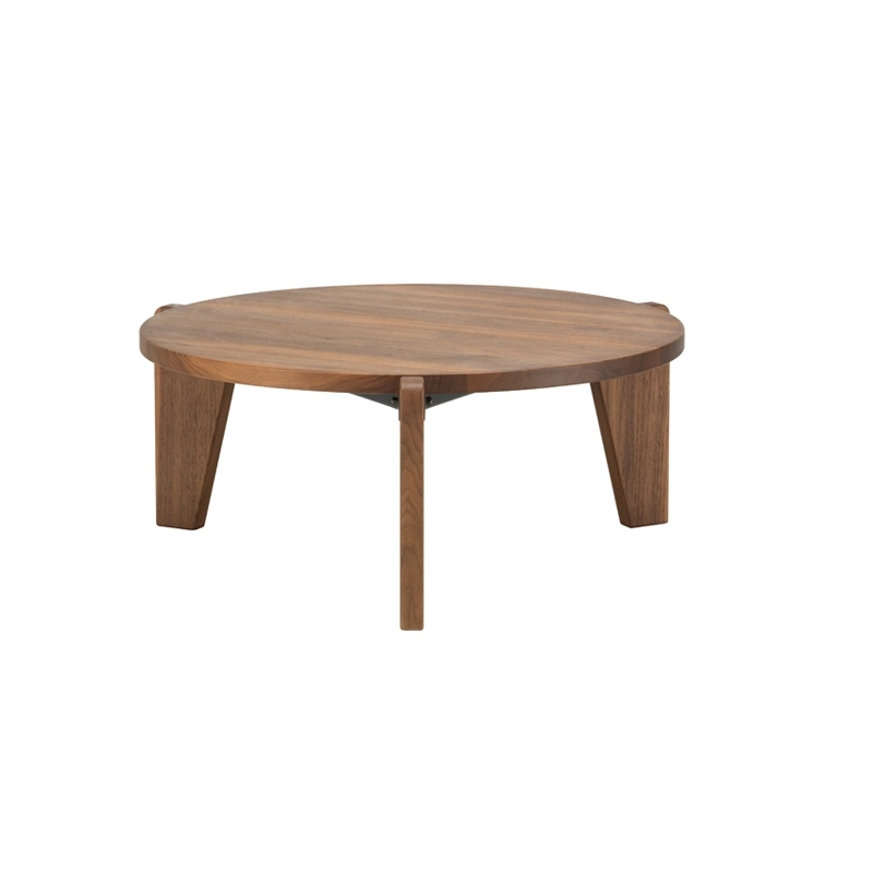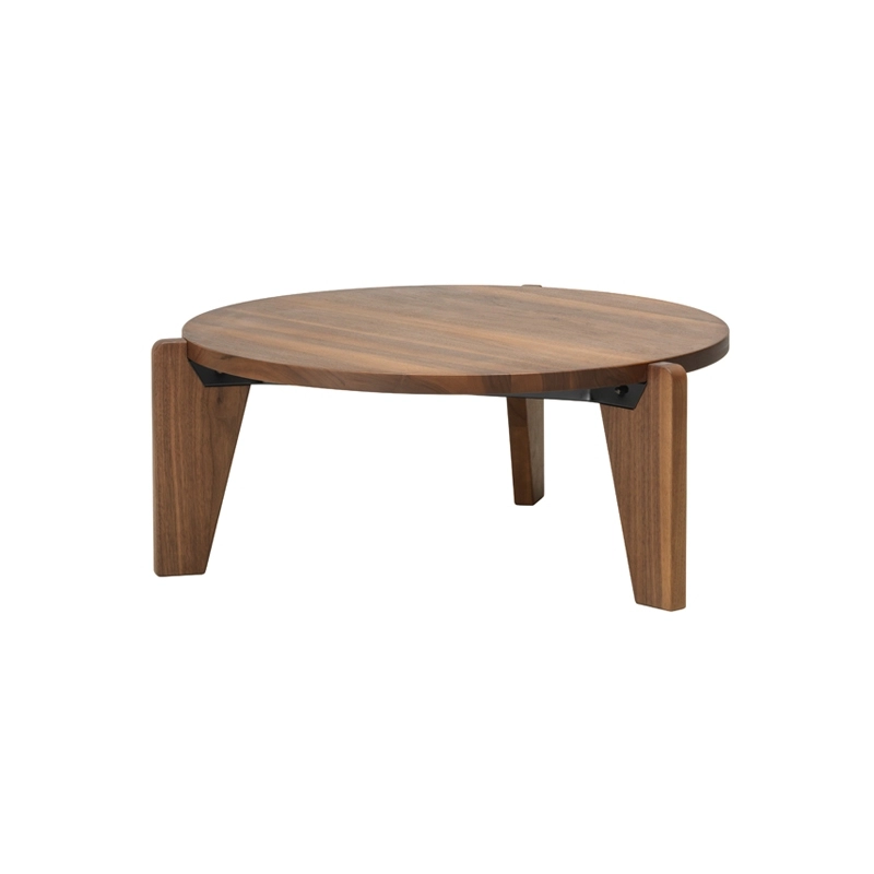 Conçue en 1944, La table basse ronde Guéridon Bas porte l'inimitable signature du créateur et ingénieur français Jean Prouvé. Au début des années 1940, Jean Prouvé se consacra de plus en plus au travail du bois. La table Guéridon Bas est composée d‘un lourd plateau en chêne massif ou en noyer américain reposant sur trois pieds élaborés dans le même bois. Ces éléments sont reliés entre eux par une structure robuste composée de tôle pliée. Editée par Vitra, Guéridon bas est une table basse à la fois épurée et chaleureuse, trouvant sa place dans tous les styles d’intérieurs.