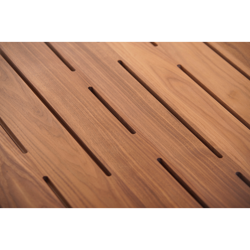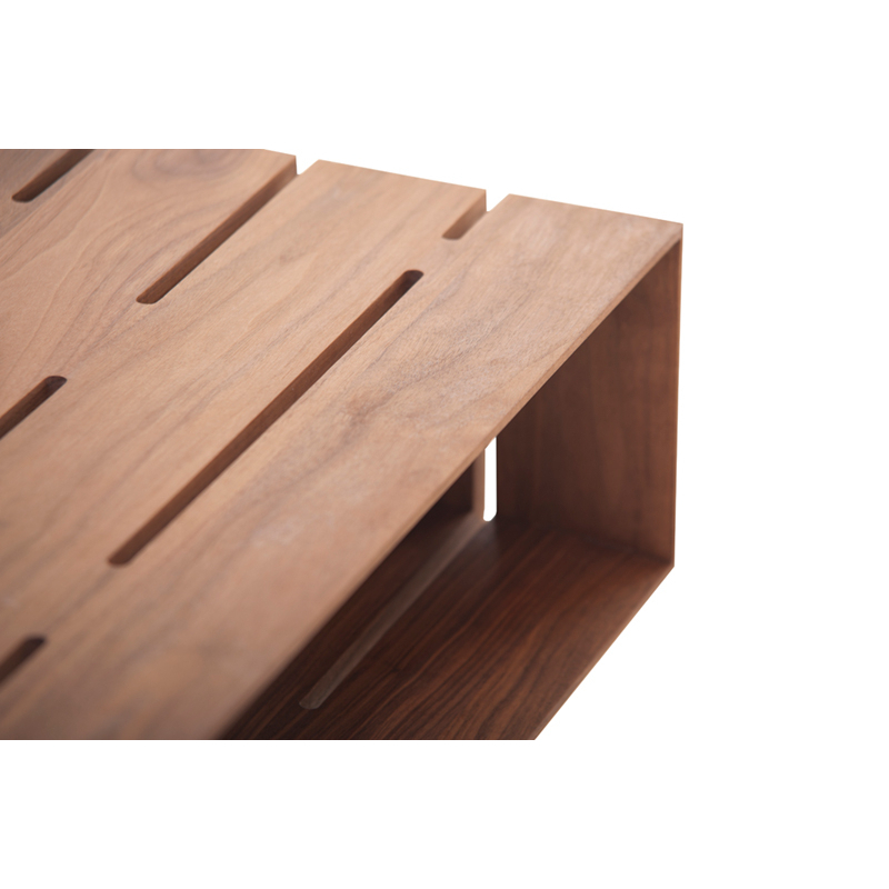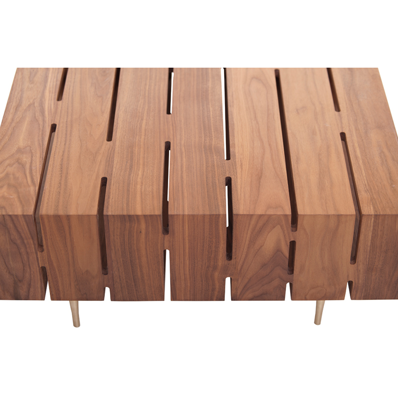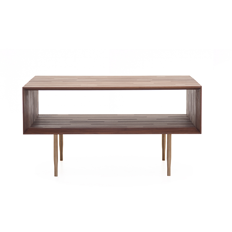 La table basse HorizonDe La Espada est une conception architecturale en bois massif reposant sur des pieds en laiton massif tourné. Le motif de fentes percées, créé par des machines, permet un stockage semi-caché et le passage de la lumière, créant de belles ombres portées. La menuiserie à onglet relie les plans de bois dans une forme de boîte, créant une forme ouverte avec une stabilité supérieure.