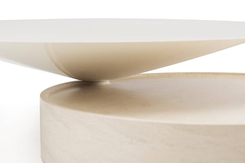 Laurel est une table basse composée de deux formes géométriques entrecroisées, un cône et un cylindre. Le cône HDF peint semble se balancer en apesanteur sur la base cylindrique en marbre. Cette table basse a une forme sculpturale qui complète n'importe quel espace. Laurel est également disponible avec une base en bois, ou comme table d'appoint avec une base en bois ou en marbre.