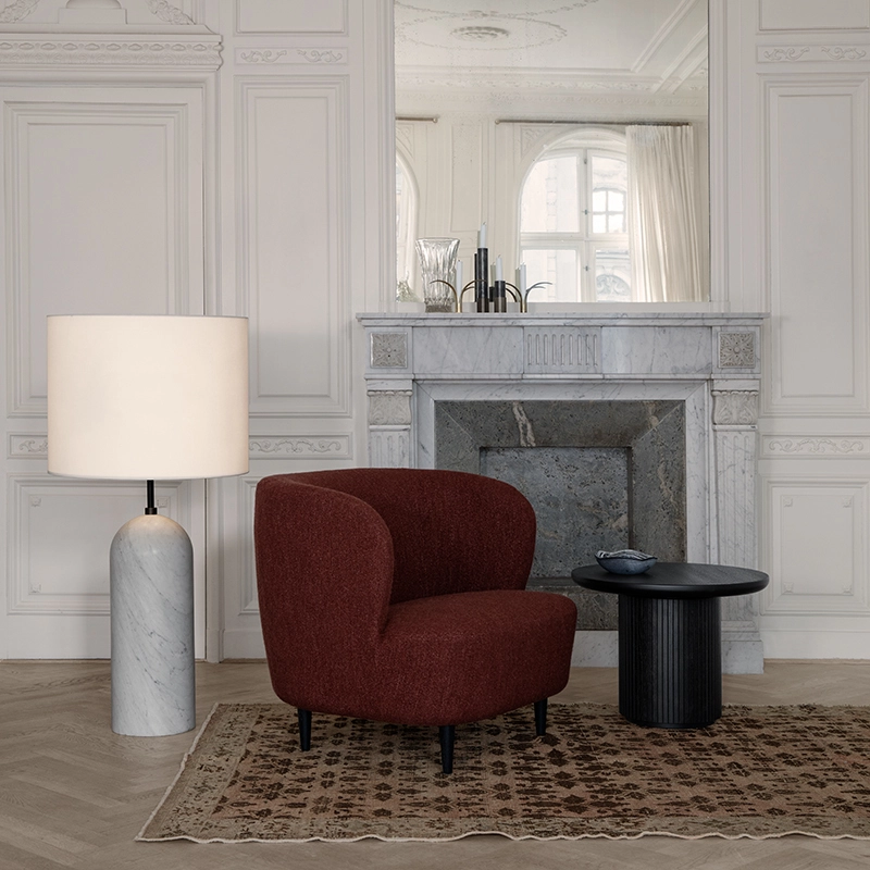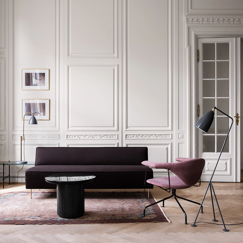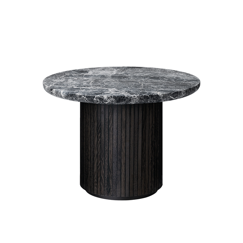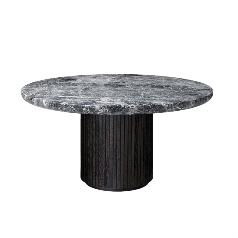 Gubi une collection de tables au formes organiques conçue aussi bien pour les espaces domestiques que publics. Le magnifique plateau de la table en marbre est fixé sur une base ronde, dotée d'une surface biseautée, servant de structure et d'ornement. L'interaction entre ces deux éléments donne à la