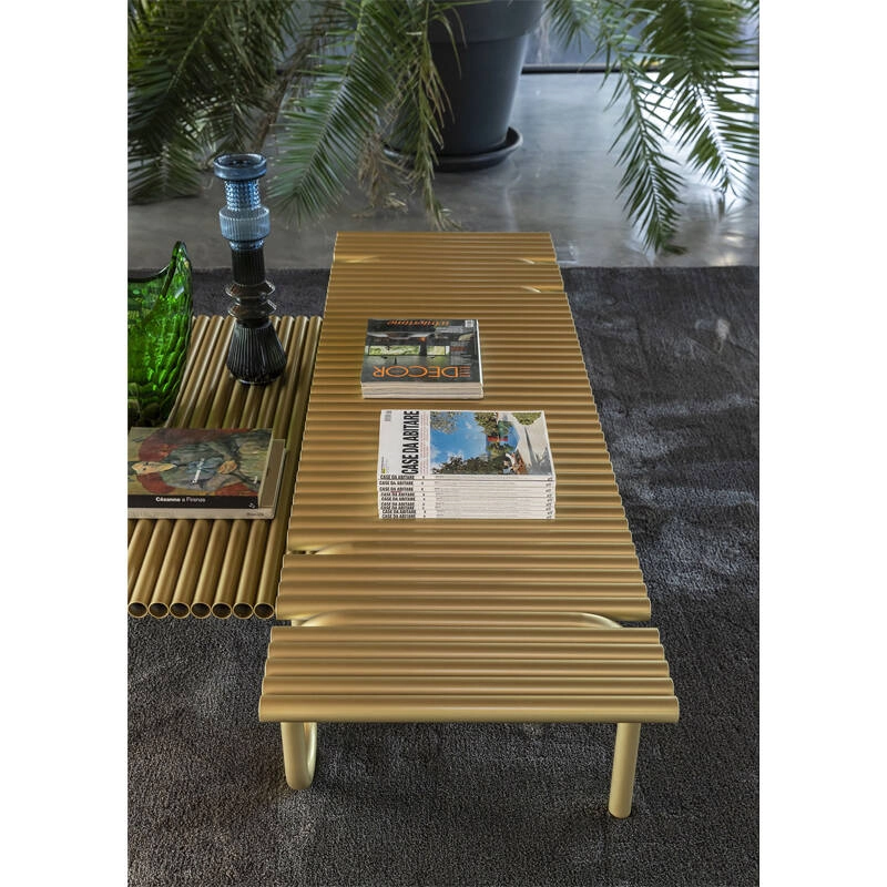 Pipelines se constitue d’un plateau qui associe des tubes métalliques peints, et recourbés par endroits pour obtenir un ou plusieurs pieds rigides. Les surfaces créées par le rythme répétitif des tubes de Pipelines créent un élégant contraste entre simplicité et solidité.
