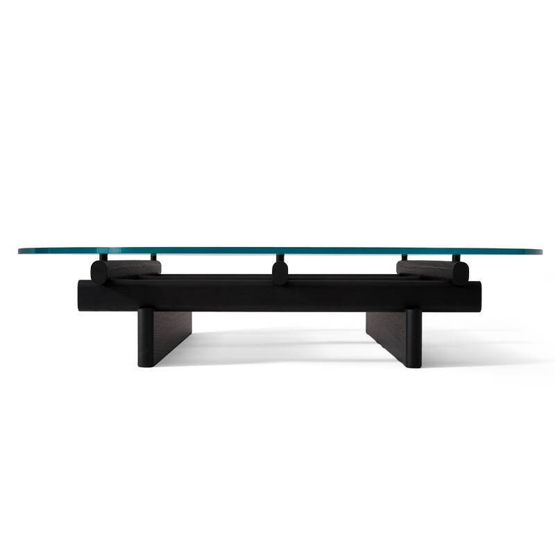 table basse Sengu Cassina est composé d'un enchevêtrement de poutres en bois massif, soutenant un plateau circulaire en verre. La