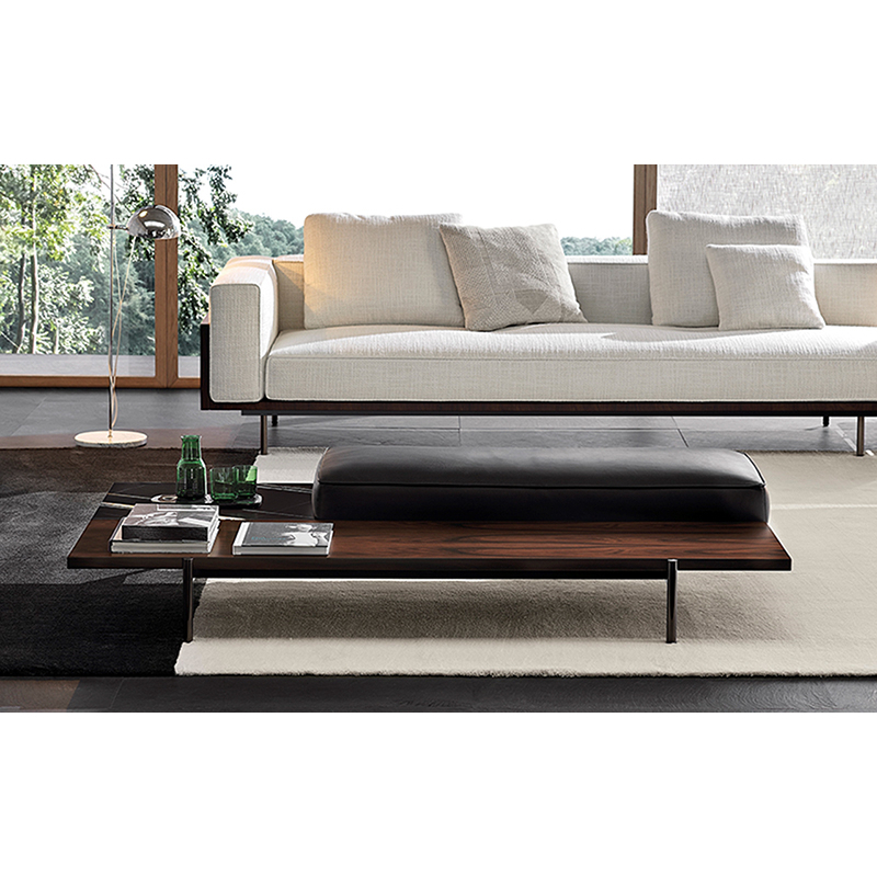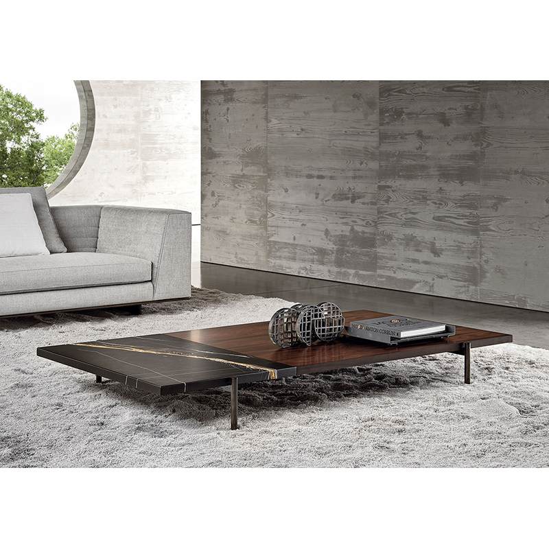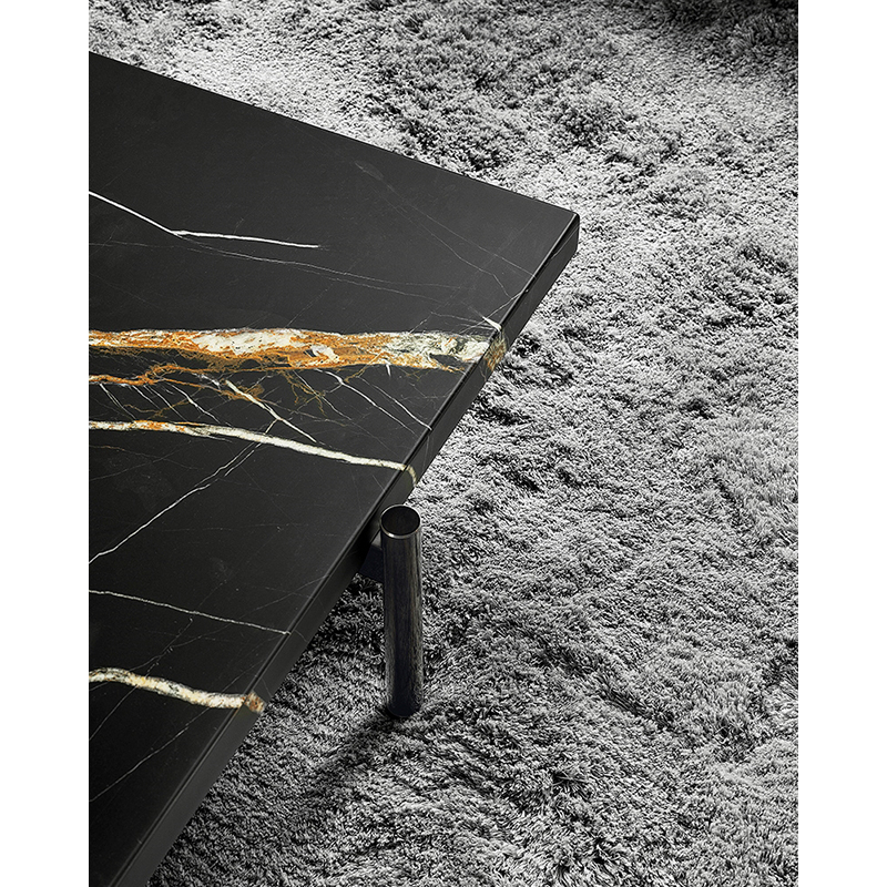 Les tables basses de Minotti Superquadra peuvent être agrémentées soit d’un plateau en marbre Calacatta ou Sahara Noir peint polyester mat -tous deux obtenus à partir d’une technique de pliage - soit en palissandre Santos teinté Dark Brown laqué polyester mat à dalle unique ou avec plateau en lattes de noyer Canaletto teinté Dark Brown.