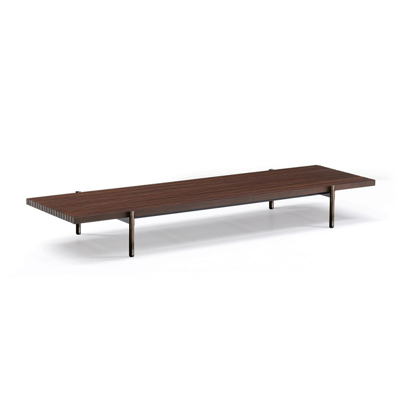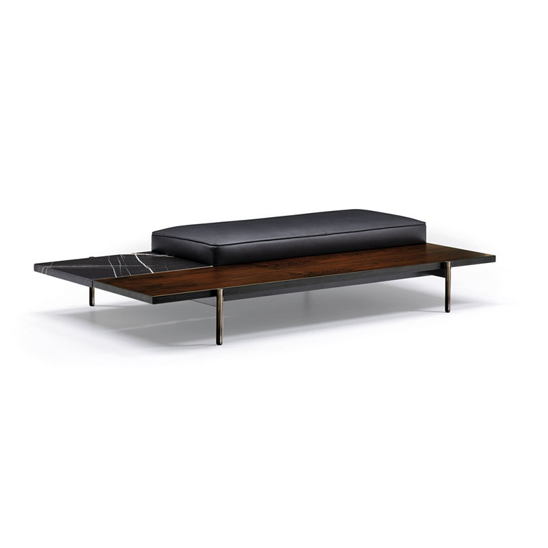 Le volume éthéré de la table Superquadra se reflète dans les lignes graphiques essentielles de la série de petites tables, banquette et consoles du même nom. Les éléments reposent sur une base aux pieds en saillie réalisés en aluminium peint Brandy brillant qui confère aux produits une grande légèreté esthétique.