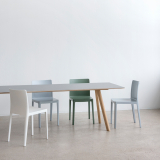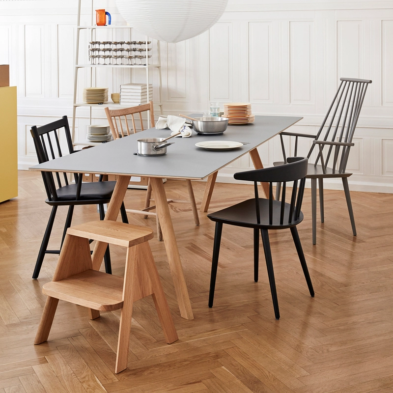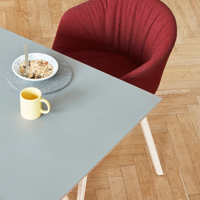 Pour sa nouvelle collection, la maison d'édition Hay invite les designers français Ronan et Erwan Bouroullec à dessiner une nouvelle gamme de mobilier pour l'Université de Copenhague. La collection comprend une chaise, un tabouret de bar et différentes tables. Les designers se sont inspirés d'une chaise d'université dessinée par l'architecte Bernt Pedersen, à l'identité simple. La série Copenhague cherche à maintenir la simplicité évidente qui marque cette chaise reprenant le piètement tréteau, tout en créant une gamme de mobilier scolaire qui s'inscrit dans notre époque et s'adapte aux besoins fonctionnels d'une université. La collection s'éloigne un peu de l'esprit institutionnel de la chaise de départ par son originalité et ses formes. La table Copenhague Table 30 est composé d'un plateau en chêne recouvert de lino, fixé sur un piètement tréteau en chêne massif. Cette table de salle à manger peut être accompagnée des chaises colorées de la même collection.