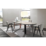 Dan reprend les tonalités de la structure dans une subtile variation de matériaux : le bois remplace l'aluminium et serti le précieux plateau en marbre de Calacatta, verre noir laqué à l’arrière, cendré fumé couleur réglisse, gris tourterelle ou ébène mate.