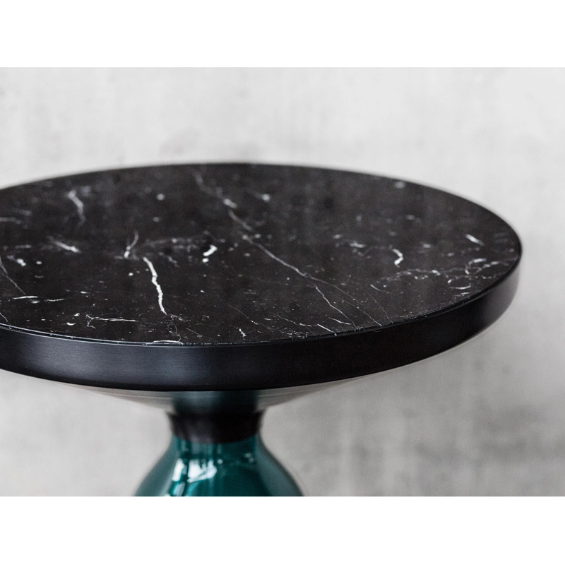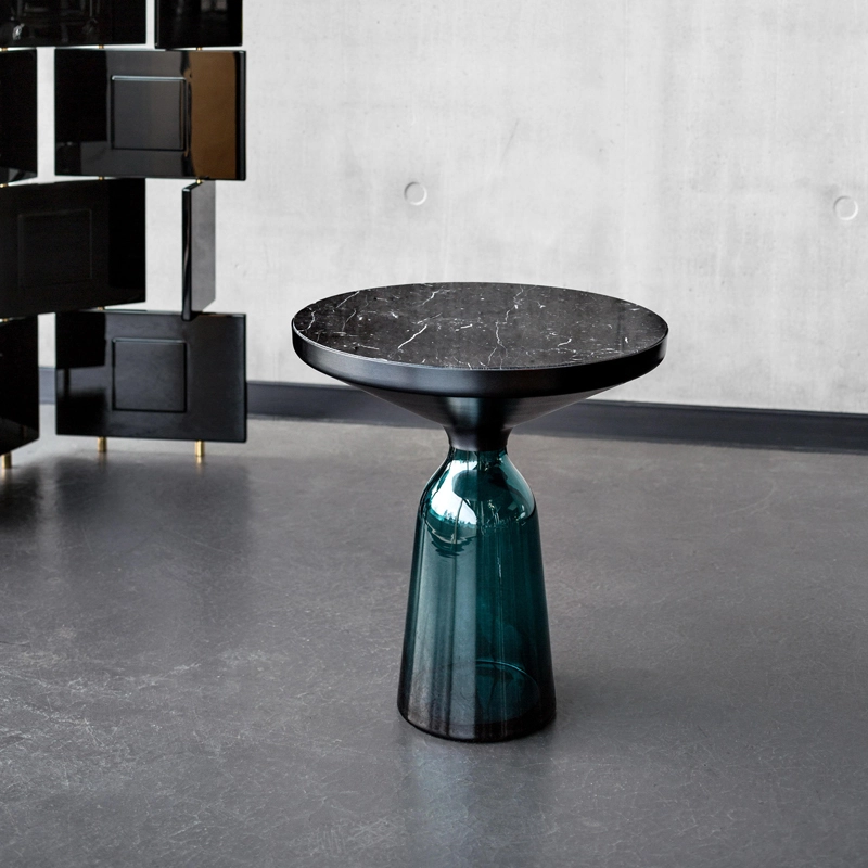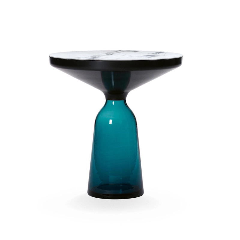 Désormais disponible avec un plateau en marbre, la collection Bell Table de Sebastian Herkner bouleverse l'usage habituel des matériaux en associant le verre, matériau léger et fragile utilisé pour la base, et un plateau réalisé en métal, qui semble flotter au-dessus. Le piétement en verre teinté est soufflé de façon traditionnelle dans un moule en bois. Avec sa présence sculpturale, il contraste avec le cadre en laiton tout en formant une unité harmonieuse rappelant les courbes d'une cloche. Grâce à ses surfaces réfléchissantes et ses matériaux opposés, la
