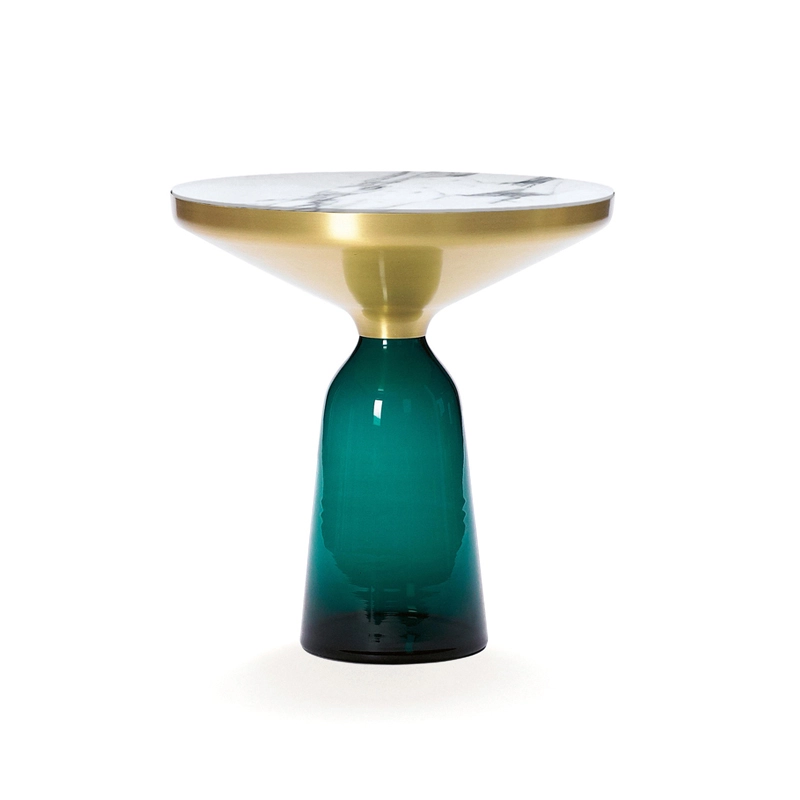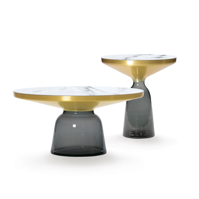 Désormais disponible avec un plateau en marbre, la collection Bell Table de Sebastian Herkner bouleverse l'usage habituel des matériaux en associant le verre, matériau léger et fragile utilisé pour la base, et un plateau réalisé en métal, qui semble flotter au-dessus. Le piétement en verre teinté est soufflé de façon traditionnelle dans un moule en bois. Avec sa présence sculpturale, il contraste avec le cadre en laiton tout en formant une unité harmonieuse rappelant les courbes d'une cloche. Grâce à ses surfaces réfléchissantes et ses matériaux opposés, la Bell Table ajoute une touche raffinée et délicate dans le salon. Elle célèbre la beauté des matériaux avec leurs couleurs et leurs formes, associées aux qualités d'un travail artisanal rigoureux. La table basse Bell Coffee et la table d'appoint Bell Side sont des pièces uniques et fragiles, chacune étant réalisée intégralement à la main et éditée par Classicon.
