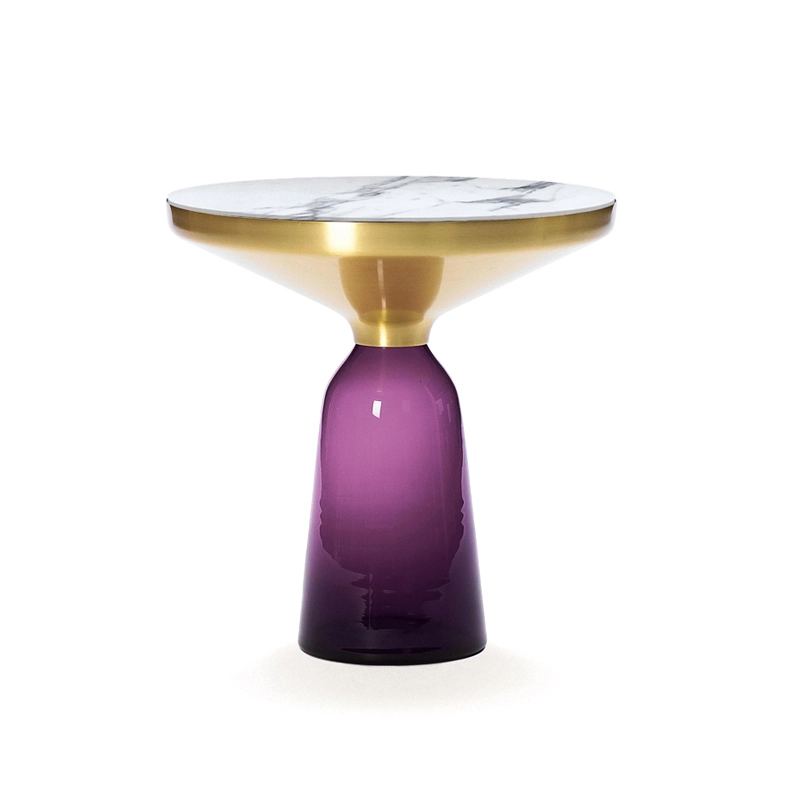 Désormais disponible avec un plateau en marbre, la collection Bell Table de Sebastian Herkner bouleverse l'usage habituel des matériaux en associant le verre, matériau léger et fragile utilisé pour la base, et un plateau réalisé en métal, qui semble flotter au-dessus. Le piétement en verre teinté est soufflé de façon traditionnelle dans un moule en bois. Avec sa présence sculpturale, il contraste avec le cadre en laiton tout en formant une unité harmonieuse rappelant les courbes d'une cloche. Grâce à ses surfaces réfléchissantes et ses matériaux opposés, la Bell Table ajoute une touche raffinée et délicate dans le salon. Elle célèbre la beauté des matériaux avec leurs couleurs et leurs formes, associées aux qualités d'un travail artisanal rigoureux. La table basse Bell Coffee et la table d'appoint Bell Side sont des pièces uniques et fragiles, chacune étant réalisée intégralement à la main et éditée par Classicon.