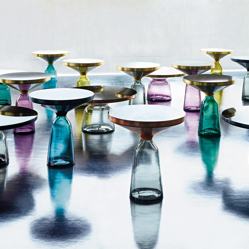La collection Bell Table de Sebastian Herkner bouleverse l'usage habituel des matériaux en associant le verre, matériau léger et fragile utilisé pour la base, et un plateau réalisé en métal, qui semble flotter au-dessus. Le piétement en verre teinté est soufflé de façon traditionnelle dans un moule en bois. Avec sa présence sculpturale, Bell Side Table contraste avec le cadre en laiton tout en formant une unité harmonieuse rappelant les courbes d'une cloche. Grâce à ses surfaces réfléchissantes et ses matériaux opposés, la Bell Side Table ajoute une touche raffinée et délicate dans le salon. Elle célèbre la beauté des matériaux avec leurs couleurs et leurs formes, associées aux qualités d'un travail artisanal rigoureux. La table basse Bell Coffee et la table d'appoint Bell Side sont des pièces uniques et fragiles, chacune étant réalisée intégralement à la main et éditée par Classicon.