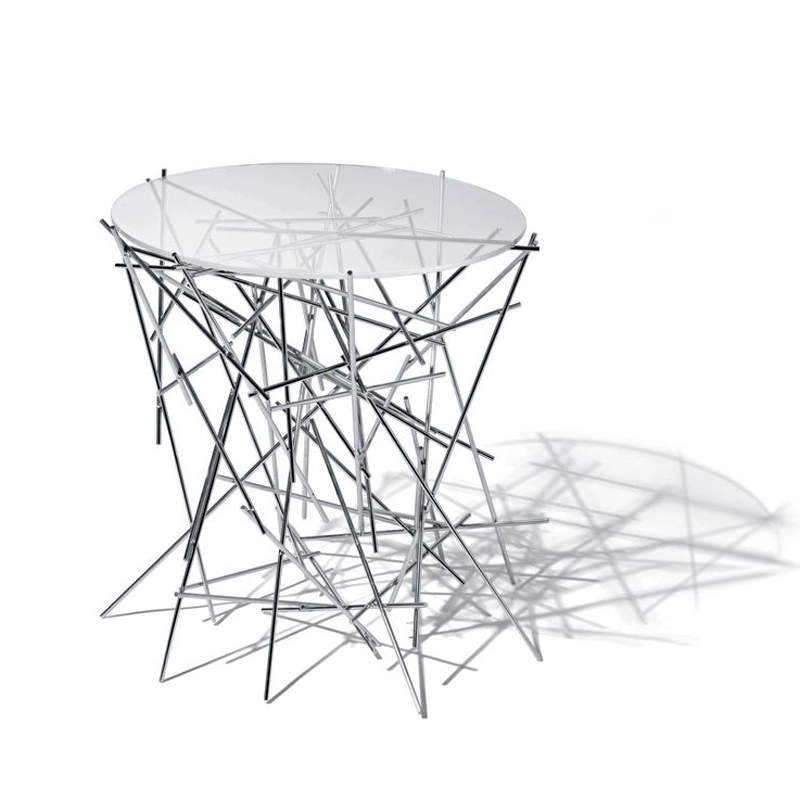 Cette petite table fait partie de la collection Blow up, dessinée par les frères Fernando et Humberto Campana et éditée par Alessi. Les formes si particulières de cette collection sont créées par les bâtonnets d'acier qui semblent avoir été assemblés au hasard , trait qui est caractéristique à de nombreux projets de ces designers brésiliens. Le plateau en verre vient se poser délicatement sur la structure en acier chromé qui joue sur les pleins et les vides. Cette petite table d'appoint au caractère sculptural s'intègre parfaitement  dans un salon en bout de canapé par exemple.