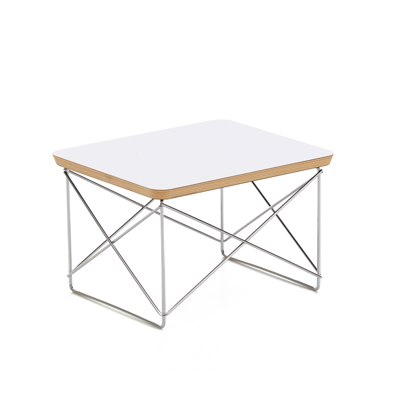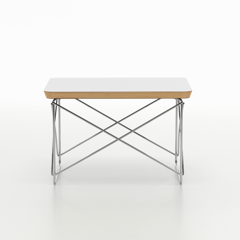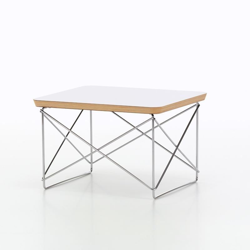 table basse LTR fait aujourd'hui partie de la collection du Vitra Design Museum. Le plateau stratifié est disponible en noir ou en blanc et la base complexe comporte deux tiges en acier galvanisé en U avec des traverses qui apportent la stabilité nécessaire pour assurer leur fonctionnalité. Une table basse