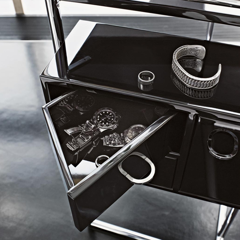 Eileen Gray, figure marquante du design du XXéme siècle, allie l?esthétique et la fonctionnalité avec sa table à maquillage Petite Coiffeuse, conçue pour la maison E 1027. Classicon édite cette petite table d'appoint originale et élégante composée d'éléments géométriques, posés sur une structure en tube d'acier chromé associée à un plateau et des rangements en MDF laqué blanc ou noir. L?ensemble se limite à l?essentiel pour en faciliter son utilisation au quotidien : chaque élément se trouve à portée de main avec le petit placard latéral dont les deux tiroirs son pivotants. Un meuble de décoration aussi pratique que sophistiqué pour une chambre de fille, et parfait pour les petits espaces.