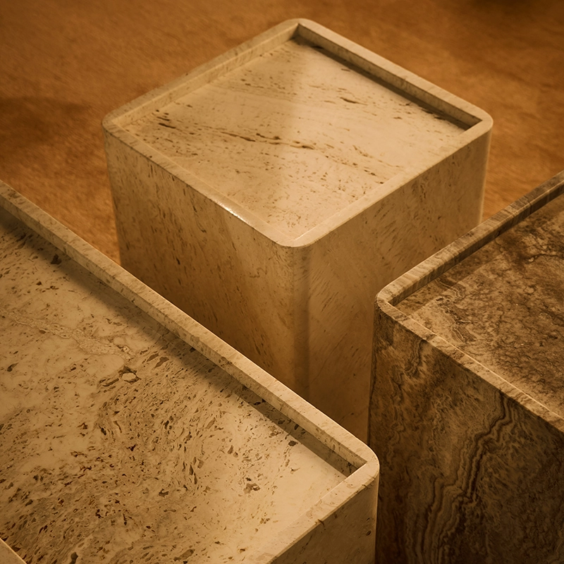 Avec Pietra, le duo GamFratesi poursuit l'exploration matérielle du travertin avec les tables Epic et Doric pour Gubi. Les tables d'appoint Pietra célèbrent les motifs fascinants de la surface de la pierre. Disponible en deux tailles et deux couleurs, chaque table Pietra est fabriquée à la main à partir de six pièces. Le résultat est une pièce qui semble avoir été sculptée dans un seul bloc de pierre. Un rebord surélevé autour du bord légèrement incurvé du plateau de la table crée une surface utile semblable à un plateau, idéale pour exposer des objets ou poser un verre en toute sécurité. Soigneusement taillés, ajustés et finis, les bords et les coins incurvés de la table Pietra montrent un extraordinaire niveau de savoir-faire artisanal et apporte à la pierre une impression de douceur.