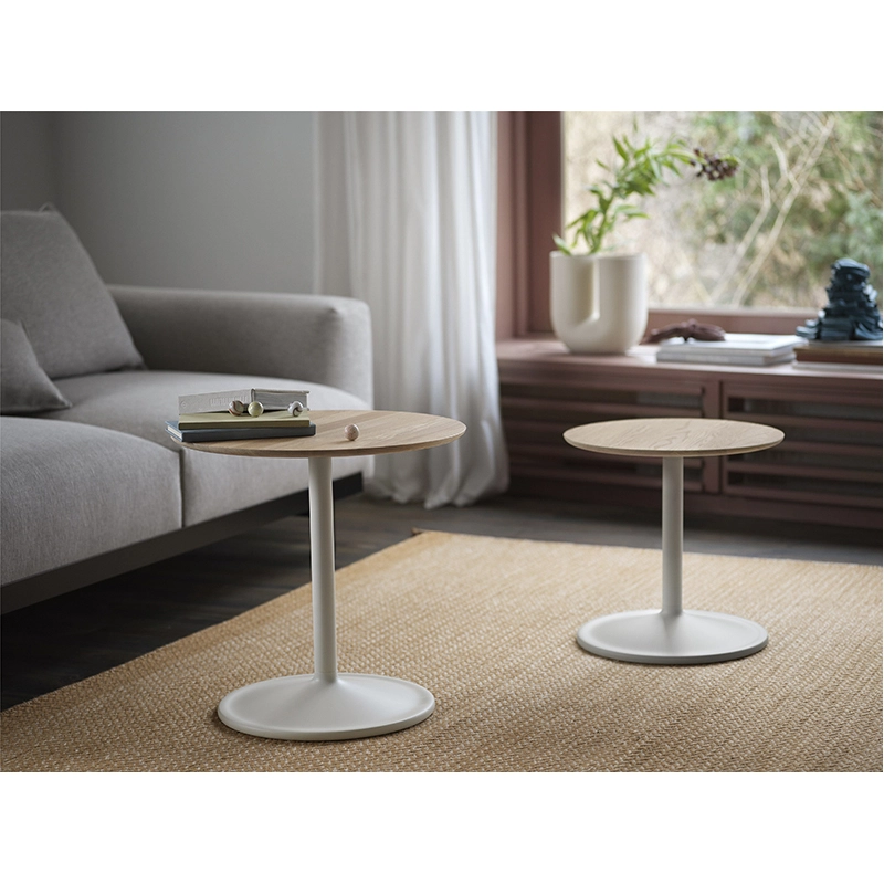 Dessinée par Jens Fager pour Muuto, la table d'appoint Soft est à la fois subtile et pleine de caractère avec sa silhouette douce et ses finitions de qualité. Parfaite pour de nombreuses applications que ce soit à la maison ou dans un environnement collectif, Soft se décline dans une variété de tailles et de finitions. La table d'appoint Soft peut être utilisée aussi bien seule qu'en combinaison de plusieurs éléments. Le pied en acier thermolaqué est associé à un plateau rond nanolaminé (noir), stratifié (vert cendré, orange), en linoléum (blanc cassé) ou en chêne massif naturel ou fumé.