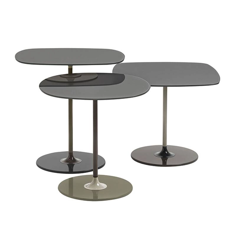 Les petites tables Thierry, dessinées par Piero Lissoni pour la marque Kartell, sont composées d'un plateau en verre et d'un pied central en métal coloré. Les finitions laquées ultra brillantes des tables Thierry, ainsi que les associations de couleurs utilisées leur donnent énormément de caractère. La beauté de ces petites tables réside dans leur apparence précieuse. La collection Thierry Kartell se décline en trois hauteurs avec des plateaux de formes différentes, ce qui permet d'associer plusieurs modèles dans des combinaisons originales.
