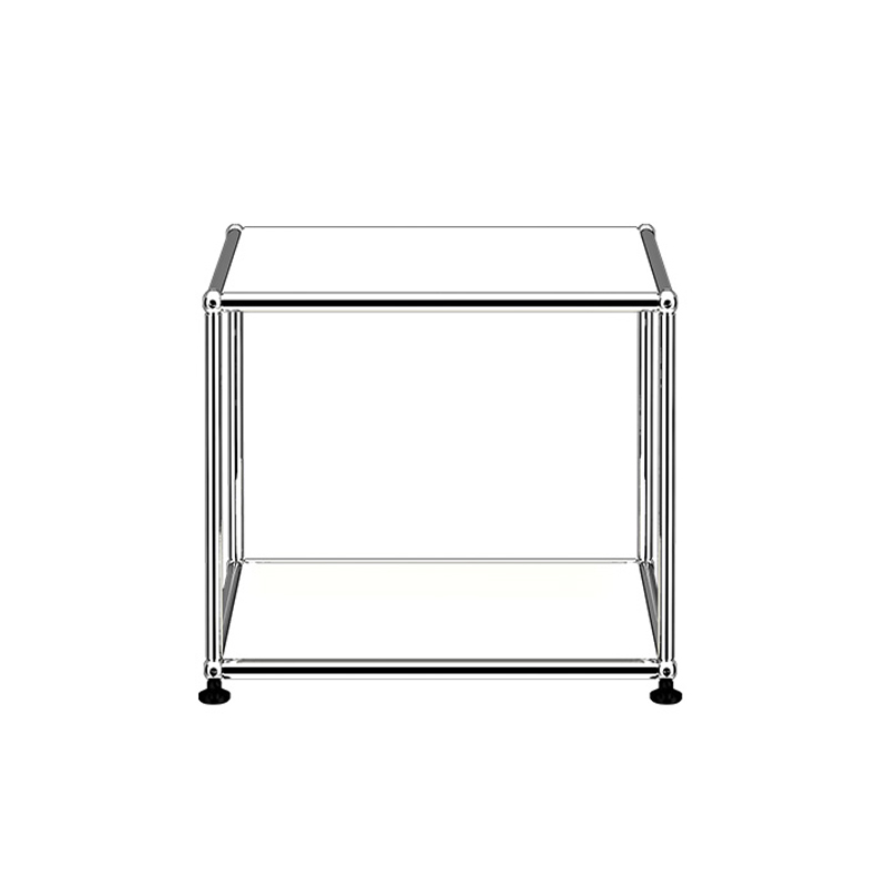 La petite table Haller M21 est dotée d'une structure en acier chromé assemblé par des boules de connexion, habillée de panneaux d'acier thermolaqué et monté sur des patins réglables en hauteur.