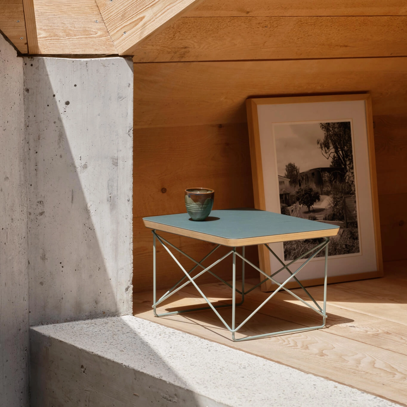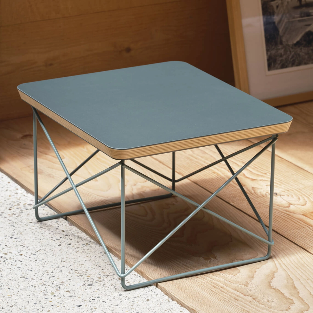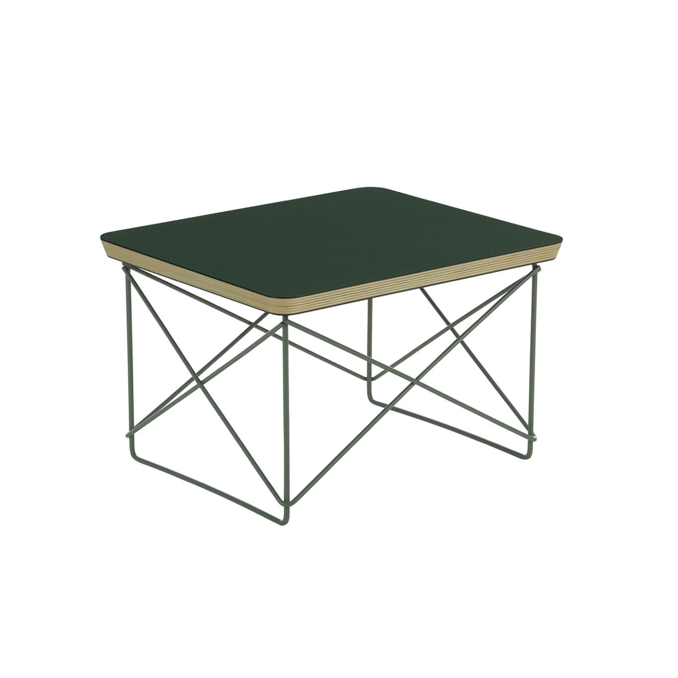 Contreplaqué de peuplier, chant laqué, stratifié en linoléum coloré, piètement en fil d‘acier en finition époxy eames sea foam green