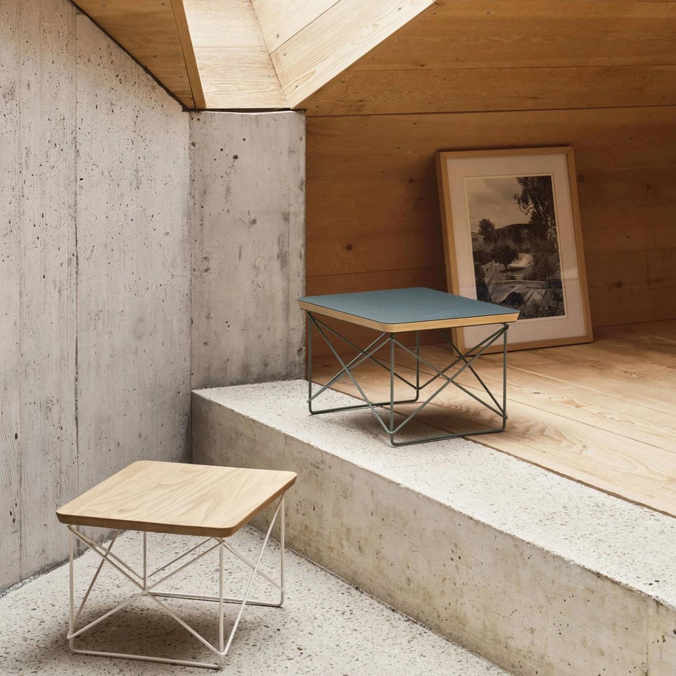 La LTR, Low Table Rod Base, a été conçue en 1950 par le couple de designers Charles et Ray Eames comme petite table basse d'appoint permettant de nombreuses variations et utilisée sous différentes formes dans leur propre maison, la Eames House. Éditées par Vitra, on y trouve aujourd'hui encore un grand nombre de ces tables, disposées séparément ou regroupées, décorées d'objets issus de la collection Eames ou faisant simplement office de tablette près d'un fauteuil et d'un canapé. La table basse LTR fait aujourd'hui partie de la collection du Vitra Design Museum. Le plateau en chêne est disponible avec une base complexe comportant deux tiges en acier galvanisé en U avec des traverses qui apportent la stabilité nécessaire pour assurer leur fonctionnalité. Une table basse Vitra qui s'adapte aisément à votre environnement : en bout de canapé, en table de chevet…