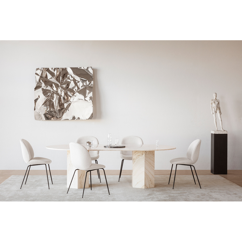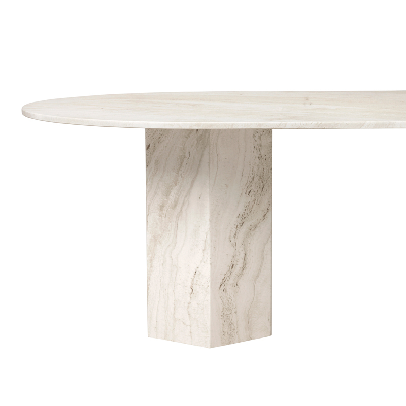Pour la collection de tables Epic, le duo GamFratesi s'est inspiré des colonnes grecques et de l'architecture romaine. Cette série de table sculpturales tient son nom des poèmes épiques de l'Antiquité. Fabriquée en Italie à partir de pierre de travertin, la forme monolithique souligne la matérialité de la pierre, la beauté naturelle de ses veines et la texture vibrante de sa patine unique - dans laquelle un nouveau détail peut être découvert à chaque utilisation. Inspirée par des exemples historiques de constructions en travertin comme le Colisée et la Basilique Saint-Pierre de Rome, et par la renaissance de ce matériau dans les années 1970 en Europe du Sud, la table Epic Elliptical combine des formes géométriques simples, le cercle et l'hexagone, avec des références à la colonne grecque classique. Avec ses dimensions généreuses, la table Epic Elliptical est parfaite des repas conviviaux avec de nombreux invités.
