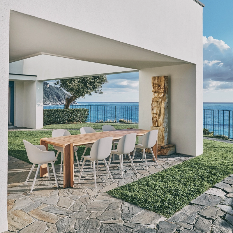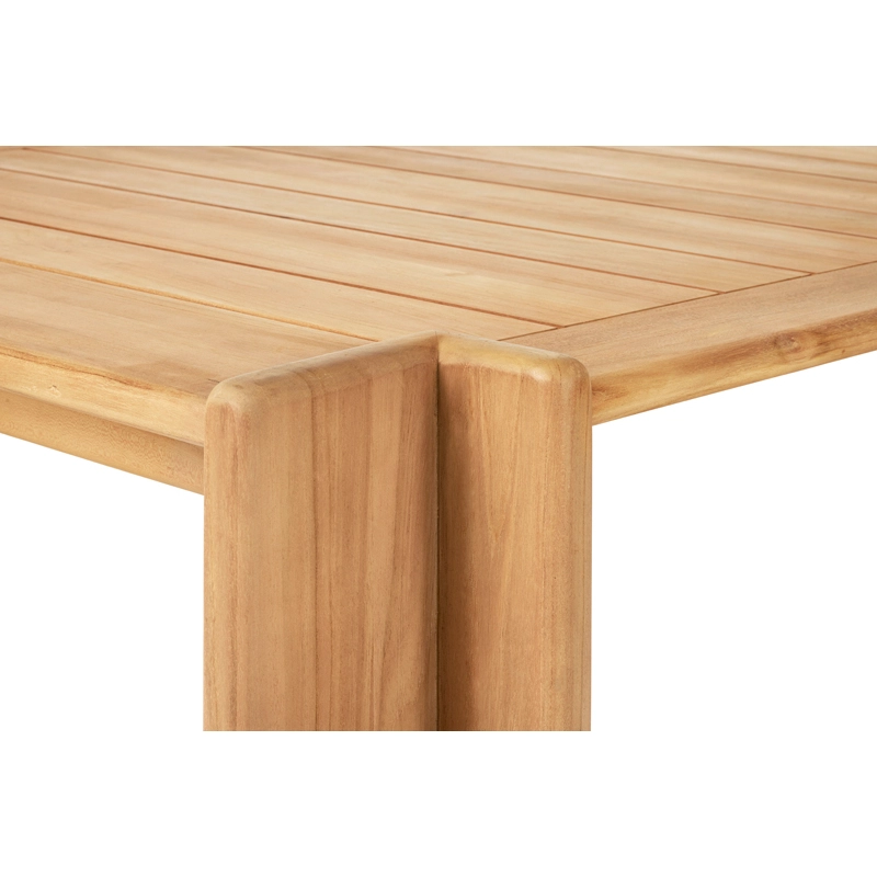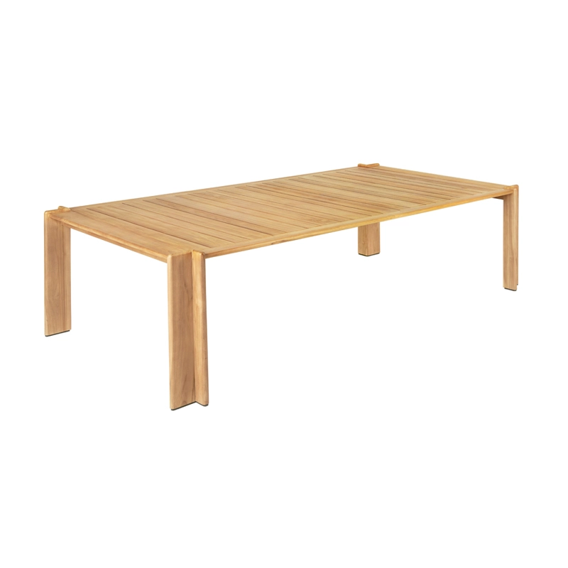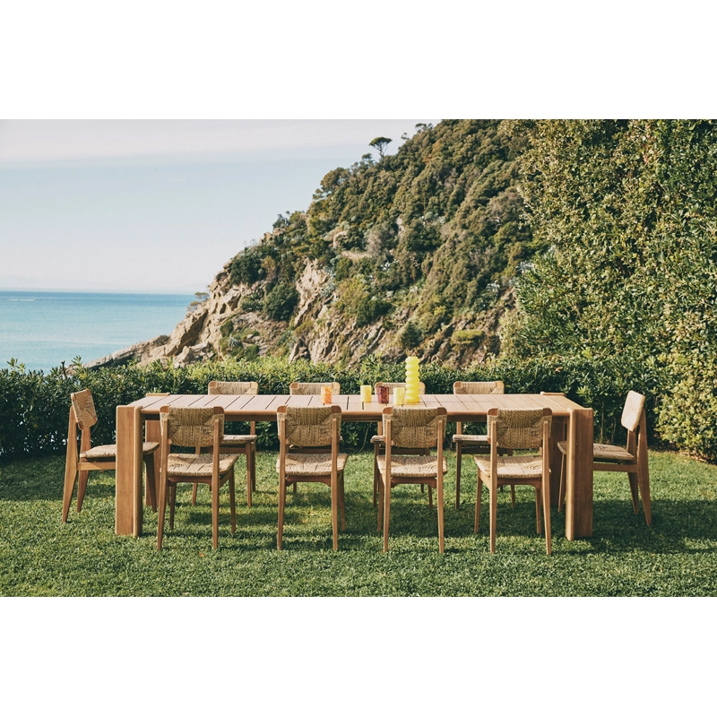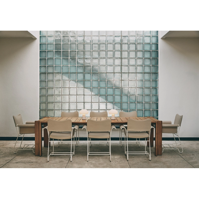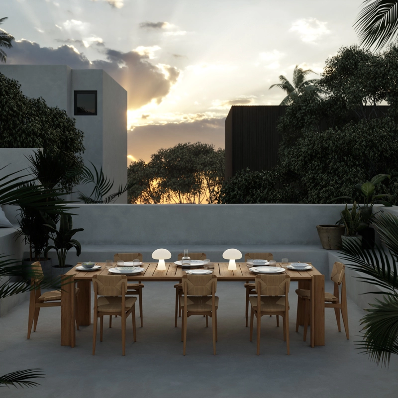 Avec Atmosfera, le studio de design de Gubi a créé une collection élégante pour l’extérieur, comprenant une table de de repas déclinée dans deux dimensions et une table basse. La collection a été conçue pour apporter une ambiance unique lors de diners ou de moments de relaxation en extérieur. Les tables Atmosfera représentent parfaitement l’attention aux détails et l’élégance calme qui caractérisent Gubi. L’esthétique simple des tables Atmosfera maintient un équilibre discret avec un clin d’œil aux références classiques, sans être trop formelle. Les plateaux sont réalisés à partir de lattes de teck de première qualité, entourés d’un cadre réalisé dans le même matériau, ce qui amène un effet minimaliste. Les pieds sont formés à partir de deux lattes verticales, créant une forme de L inversé à chaque coin. Faisant référence au design maritime et architectural, les pieds procurent à la fois un support structurel et un intérêt visuel, donnant à l’ensemble une certaine légèreté. Chaque pied dépasse légèrement au-dessus de la surface de la table, finissant par un détail arrondi qui contraste avec les lignes géométriques de la structure.  La réalisation en teck des tables Atmosfera leur permet de s’intégrer dans divers espaces intérieurs comme extérieurs et quel que soit le climat. Ainsi les tables peuvent être laissées dehors, non couvertes et non traitées toute l’année, et prendront au fil du temps une belle patine. Pour ceux qui préfèreront conserver les tons « miel-or » du bois, les tables peuvent être huilées annuellement, ou démontées pour être rangées à l’intérieur.