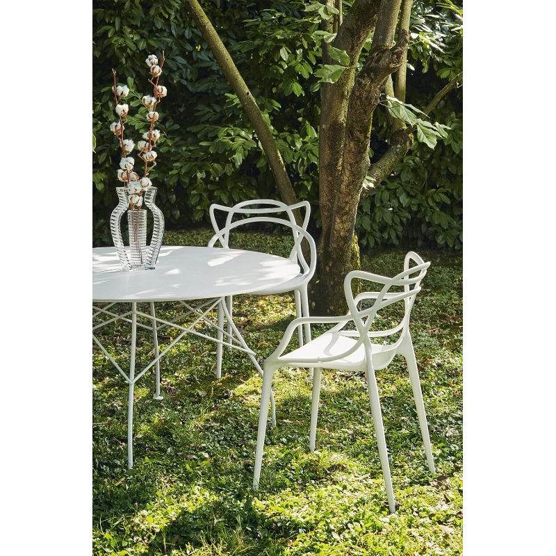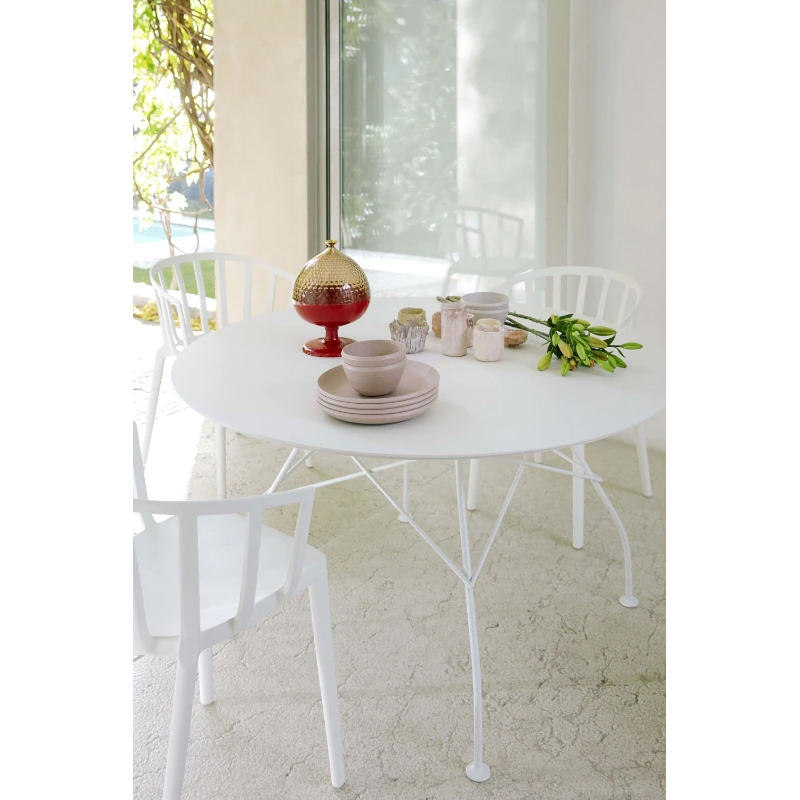Glossy Outdoor est dotée d'une structure légère et très architecturale en acier. Le piètement filaire se caractérise par l’utilisation de l’élément en croix qui relie les pieds sur chacun des quatre côtés et soutient le plateau. Très conviviale, la
