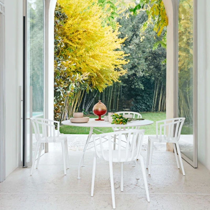 Glossy Outdoor est dotée d'une structure légère et très architecturale en acier. Le piètement filaire se caractérise par l’utilisation de l’élément en croix qui relie les pieds sur chacun des quatre côtés et soutient le plateau. Très conviviale, la table